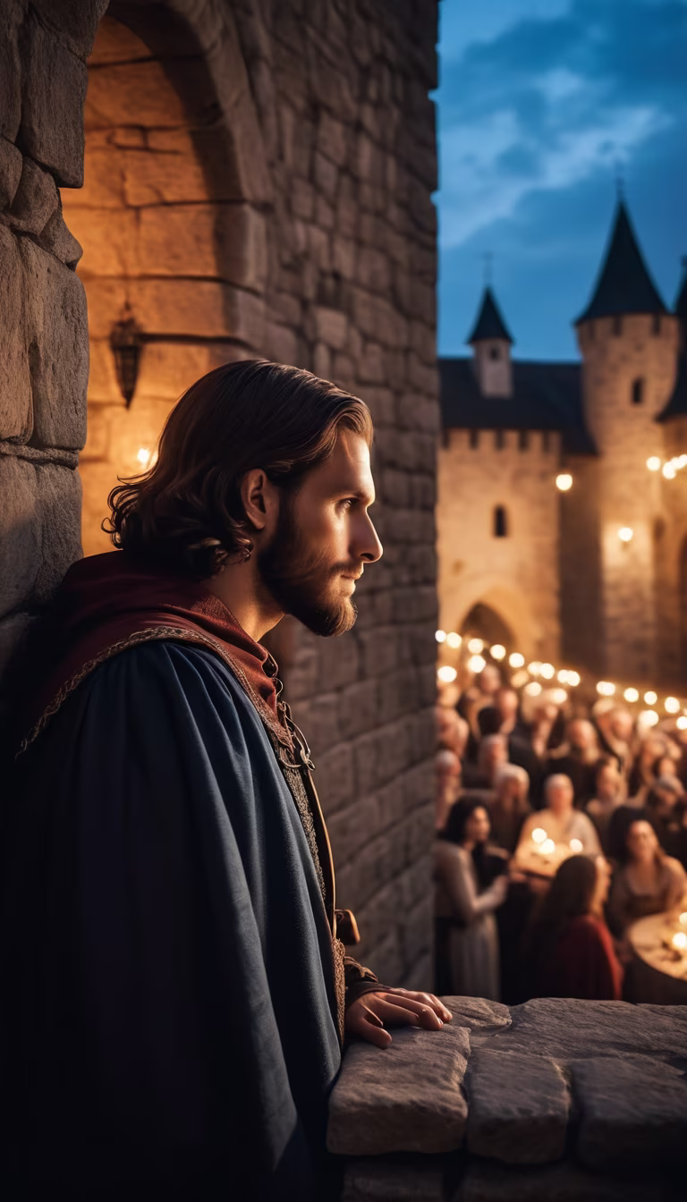 Prompt: A man waching a medieval party on a crowded place, seen hidden from a window on a stone wall. 15th century style