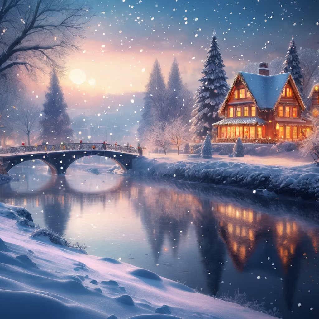 Prompt: Hyper-detailed winter landscape, dramatic lighting of falling snow, Breathtaking atmosphere of holiday magic, Perfectly captured reflections on icy surfaces, Breathtaking masterpiece scenery, Immersive environment of seasonal charm, Minutely detailed textures under natural light, Luminous color palette brings festive cheer, Hypnotic level of realism transports the viewer, Virtuosic digital painting set in winter wonderland, Smooth animation takes you into the scene, Vivid and evocative context of xmas wonderland.