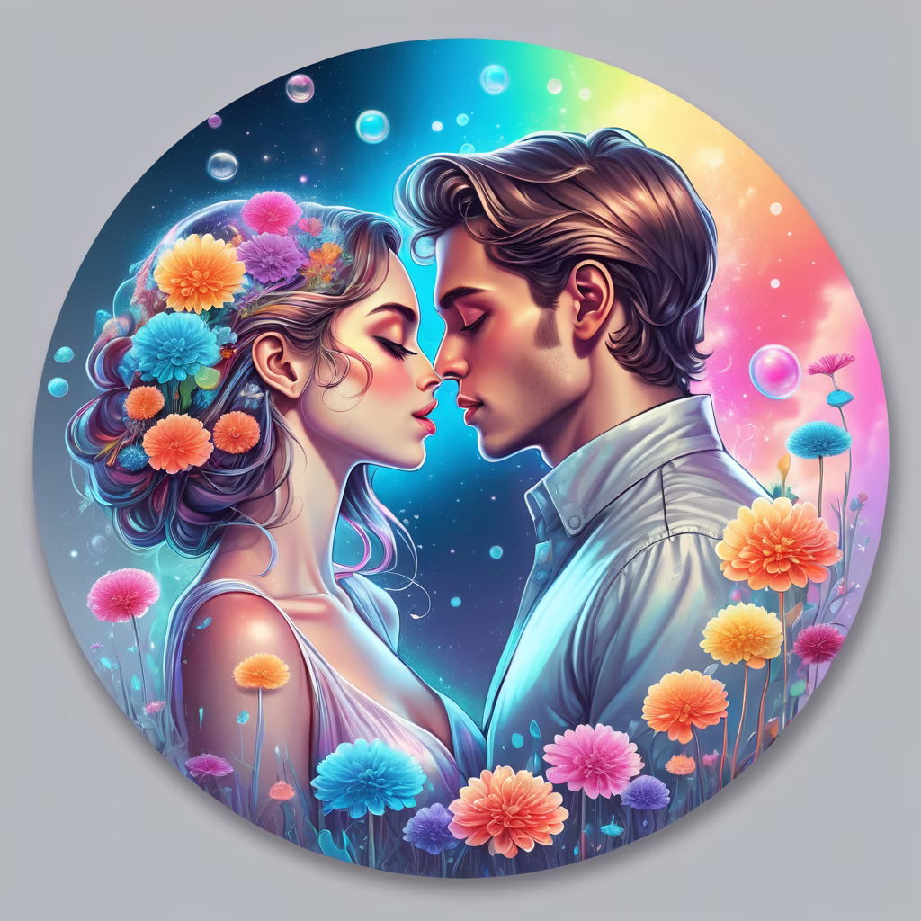 Prompt: a young couple almost kissing, sensual, sexy, admiring, elegant with an aura radiating visible energy, bathed in a bright rainbow aura of ethereal magical bioluminescence, digital art in a fantastic bubble wonderland, with flowers, dreamlike colors , whimsical, vibrant and pastel, influenced by GMUNK, beep,
