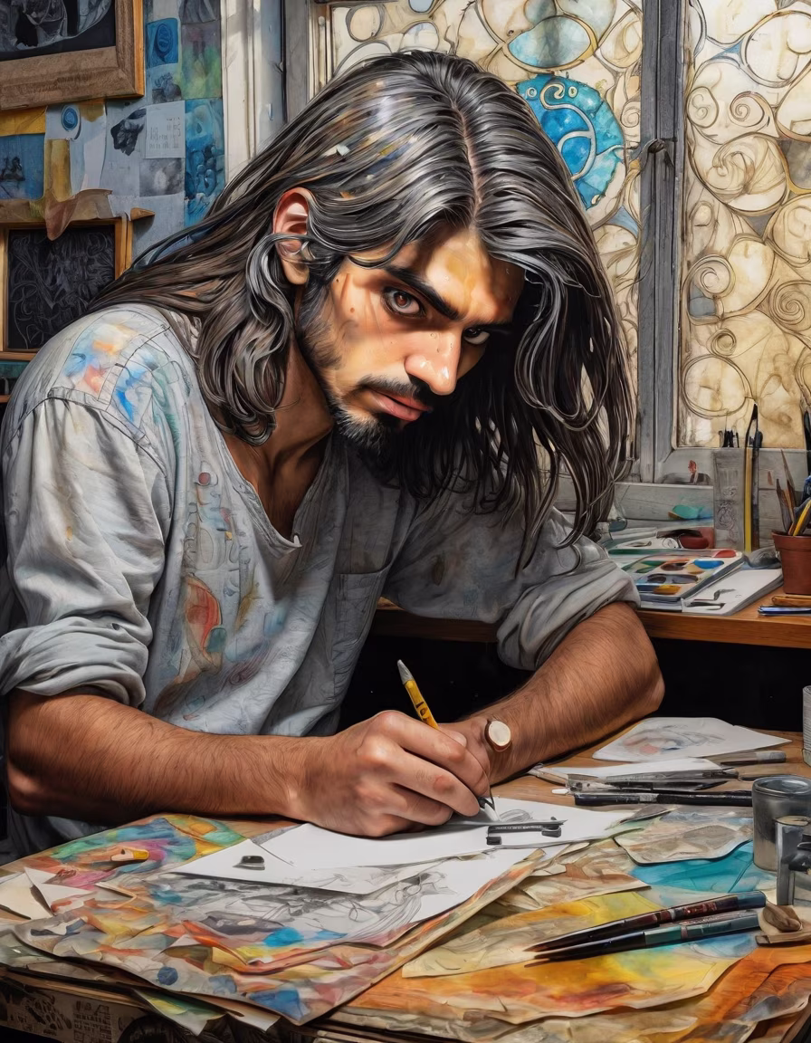 Prompt: \u003c@1126671146021048452\u003e's DreamPrompt:`gouache painting on the table in the art studio, anime, Iranian man face, 19 years old, long hair, cartoon, 2d, journal, book, leather, artist's workplace, the rays of the sun fall from the window,deep textures, mixed media collage, exclusively intricate, meticulous, dimension, dimensional layers, layer shadows, paper patchwork, patched background, old paper, pen doodles, zentangle, hand drawings, antique ephemera, torn sketches, outlines, stitching, colorful, visible brush strokes, splatter, splash, stains, watercolor, acrylic, gesso, mark making, painted tissue paper, complex and intricate details, perfect composition, masterpiece, dynamic lighting, ultra detailed, sharp focus, thin and elegant elements, detailed facial features, hyper detailed, hyper sharp 16 k resolution post processing, volumetric light, 64 megapixels, f/2.8,` Negative:`Bad art, close up, out of frame, ugly, blurry, sloppy, messy, blob, stained, jpg artefacts, watermark, inscription, letters, weird eyes, weird face,` Style:`Sticker`