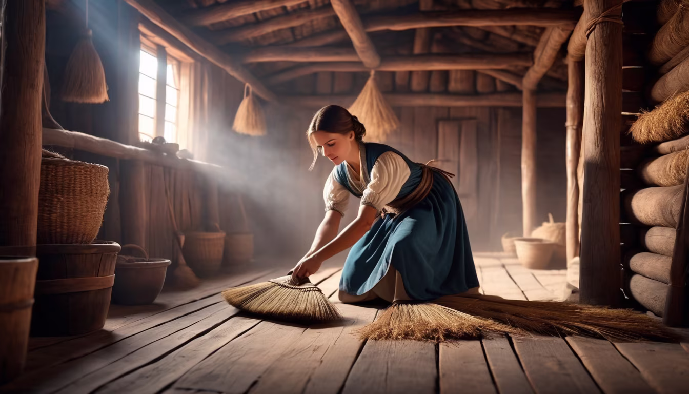 Prompt: realism, clear details, a woman sweeping the floor, in the hands of a woman broom, village hut, ancient Russia 18-19 century, haze, magic, high quality leather, 4 k,
