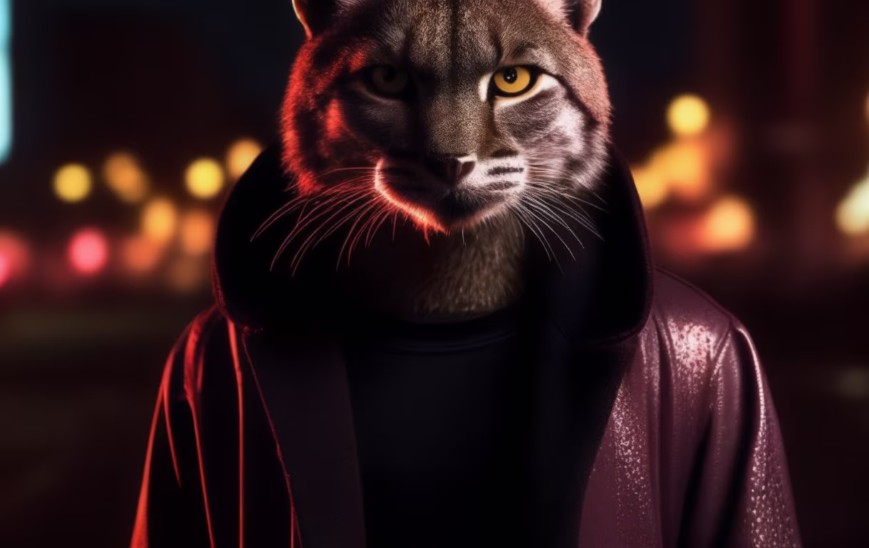 Prompt: anthropomorphic bobcat looking into the camera with a serious look on his face wearing an open black trench coat and a maroon t-shirt underneath in an industrial futuristic city at night neon and steam in the background high-quality, photo realistic, dynamic lighting, chiaroscuro