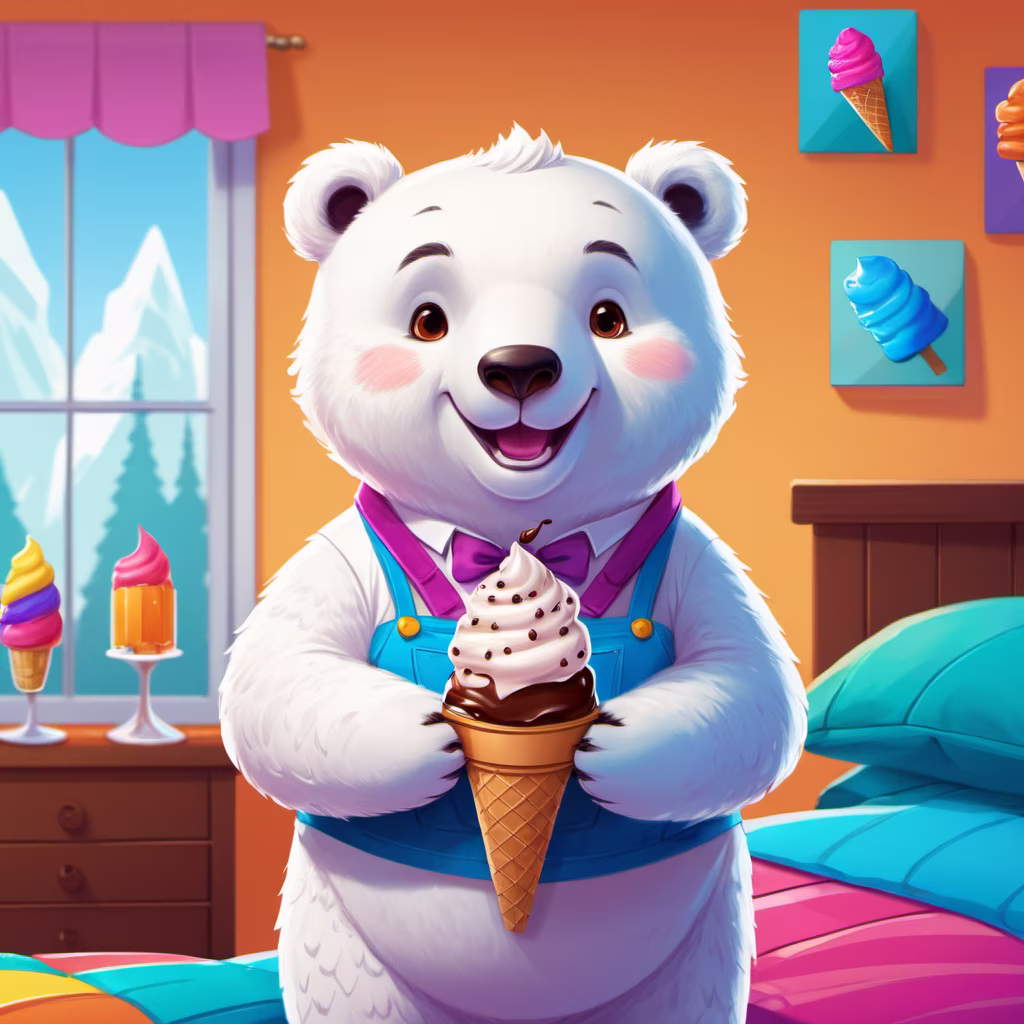 Prompt: Cute white bear with a big belly, smiling and holding two pieces of chocolate ice cream in both hands, in a bedroom interior, in a colorful comic style, every element is very detailed, highlighting the high quality of the image, with its imaginative and visual The stunning presentation captivated the audience.