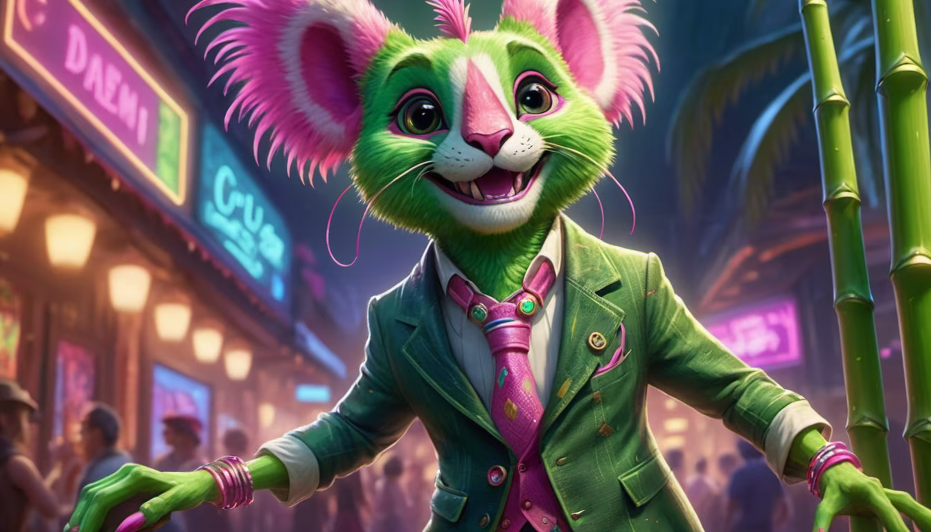 Prompt: wonderful and enchanting portrait in a dynamic pose of a cute green/pink skinned, anthropomorphic sugarcane character with tail, with bracelet dancing in a metal discotheque, colorful lights around, highly detailed, 8k, elaborate, fun spring vibes, loud music, modern realistic bright lighting. by Thomas Kinkade. movie still. fantasy