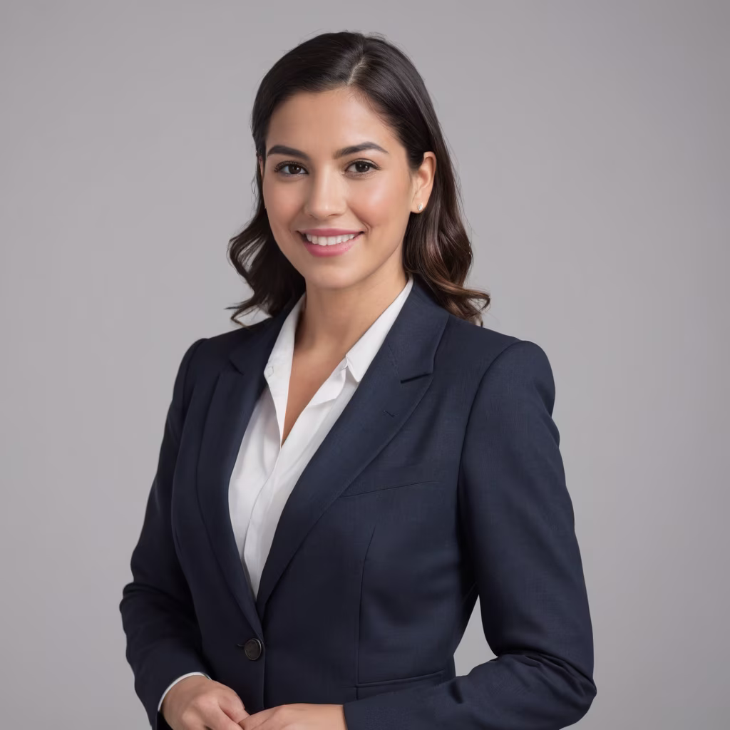 Prompt: A hispanic businesswoman wearing a suit in the 40s looking at the camera, smiling, full body, plain white background, ultra realistic, natural light, 8k