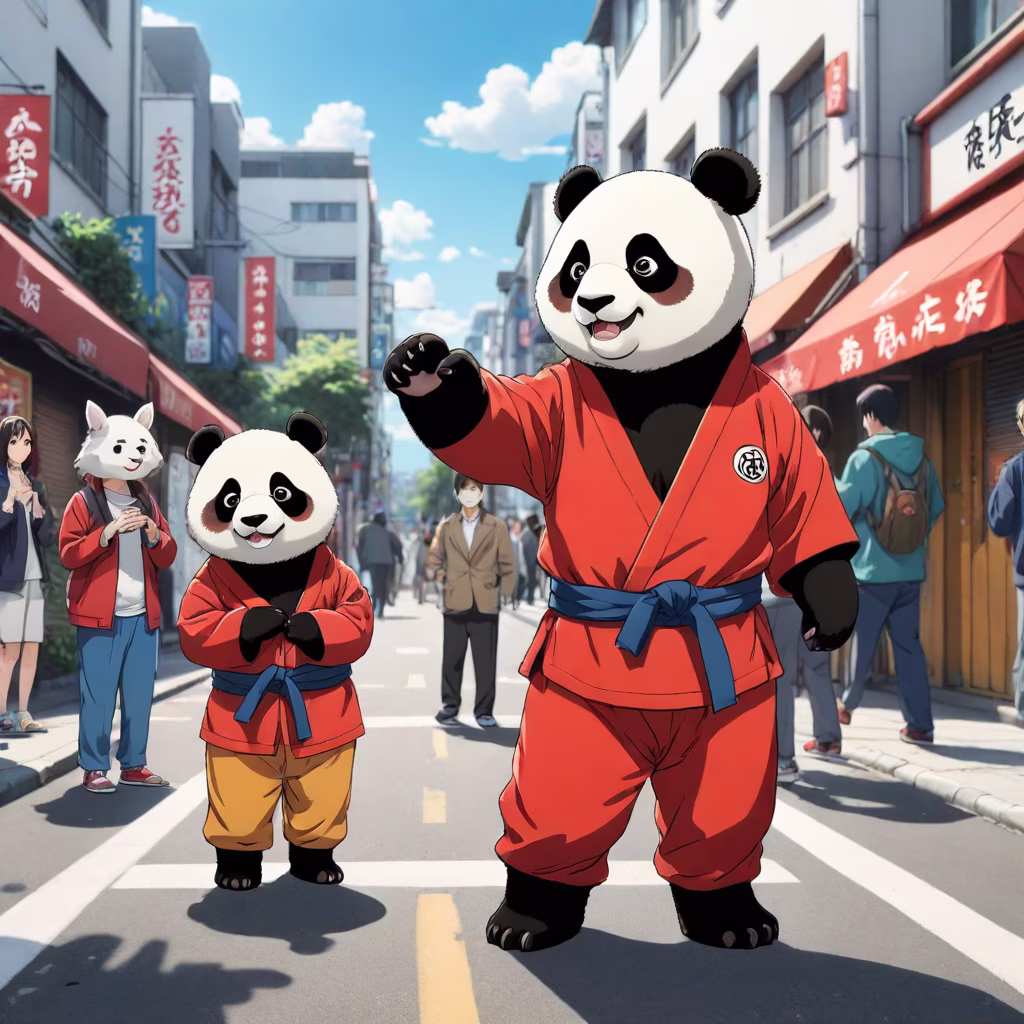 Prompt: On the street, on both sides of the street are low and flat houses and commodities. A group of people surround a panda, which is dressed in a red martial arts suit with the word \\\"dragon\\\" on it. The panda poses in the posture of Bruce Lee holding a double stick, with horse steps, mouth wide open, and shouting \\\"ah\\\". Pedestrians on the road clap their hands and say hello,Panda turns around, holding a double amputated stick