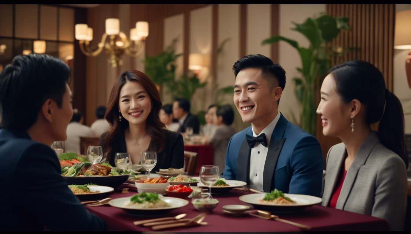 Prompt: (Camera frontal shot of Huang Hao), a young entrepreneur, Huang Hao, having dinner with his brother and sister-in-law. A large luxurious room, smiles, and beauty. seed:3518198709