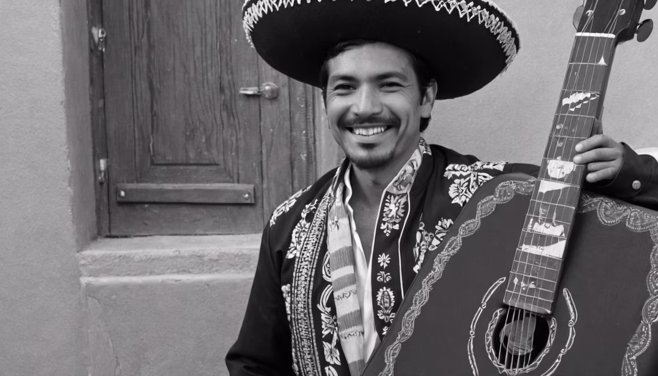 Prompt: A Mexican man wearing traditional holiday clothes is leaning against an upright black guitar case, smiling happily