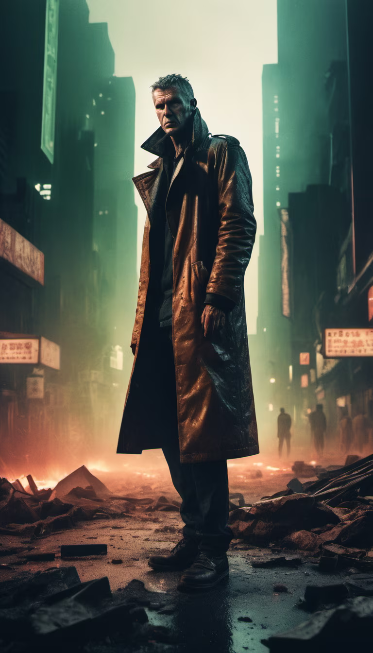 Prompt: A raging inferno engulfs a person or a city within a desolate wasteland, symbolizing destruction and rebirth. blade runner subsurface scattering, 35mm/polaroid, sanguine, celadon, amber, desaturated, faded, dirt corrosion, double exposure, light pollution, aged, scratches, blemishes, torn, burnt, dark green, amber, black, desaturated