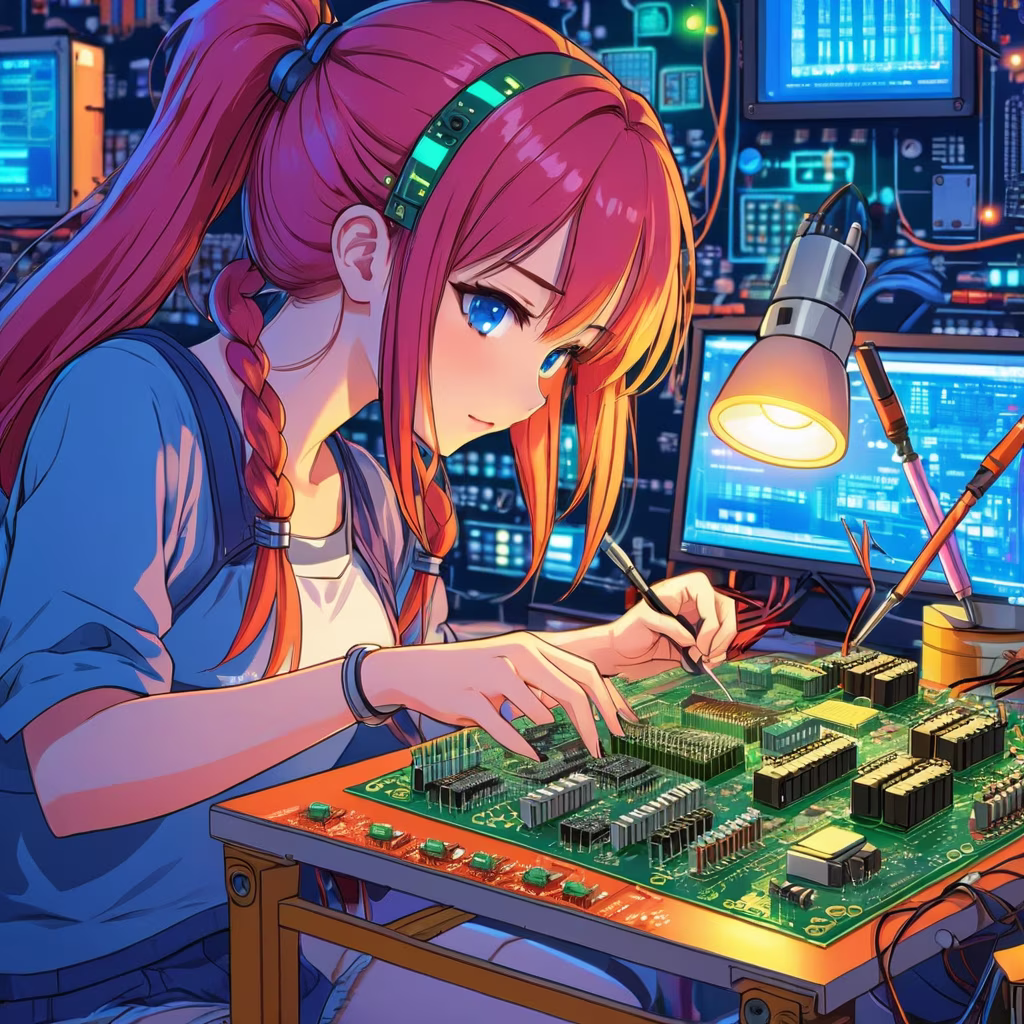 Prompt: Anime girl placing electronic smd components on a printed circuit board, soldering, resistors, capacitors, cute, designators, test equipment in background