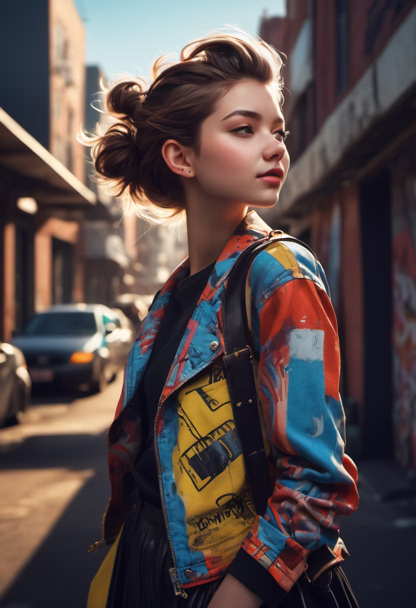 Prompt: Prompt: silhouette, fashionista, HDR 64K digital painting, view from the back, A whimsical, rebellious, fashionable, and modern 18-year-old girl is depicted in a joyful moment. The scene is a full body close-up shot showcasing her mischievous grin. The lighting is teasingly playful, with subtle shadows adding depth to the expression on her face. The overall mood is vibrant and energetic. The style is trendy and contemporary, with a touch of boldness and attitude. The image should capture her unique fashion sense and modern essence. The art should be highly detailed, showcasing intricate patterns and textures in her clothing and accessories. The background could feature elements of urban cityscape or grafffiti, adding to the rebellious vibe. Artists such as Audrey Kawasaki Loish, and Amélie Hutt come to mind for reference. This prompt is meant to be a celebration of youth, individuality , and the joy of being young and carefree.