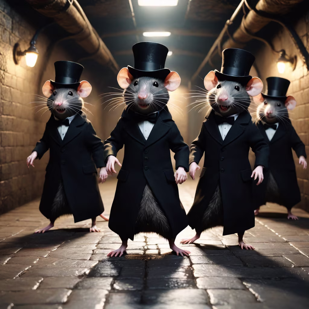 Prompt: rats with black hats , sideburns and black coats with big noses dancing in the sewers , realistic 4k