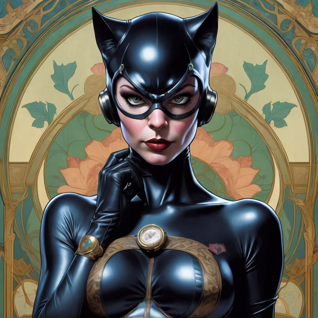 Prompt: A hyper-realistic photographic, fullbody of catwoman , in the style of Alphonse Mucha and Kelly Sue Deconnick and Matt Fraction, hipster, elaborate detail, latex, distinctive noses