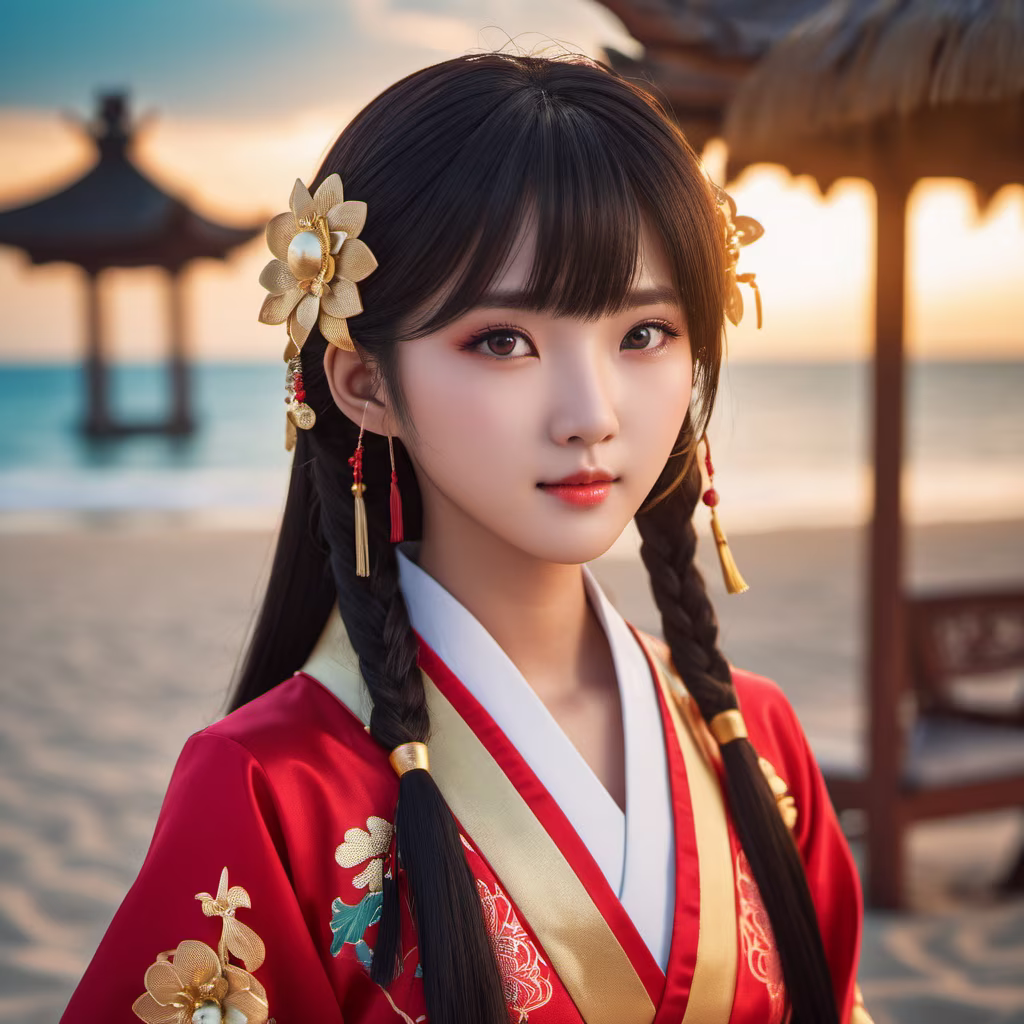 Prompt: Disney Mulan at the beach. She wears a one-piece swimsuit inspired by her outfit in the cartoon. Kdrama style.4k realistic