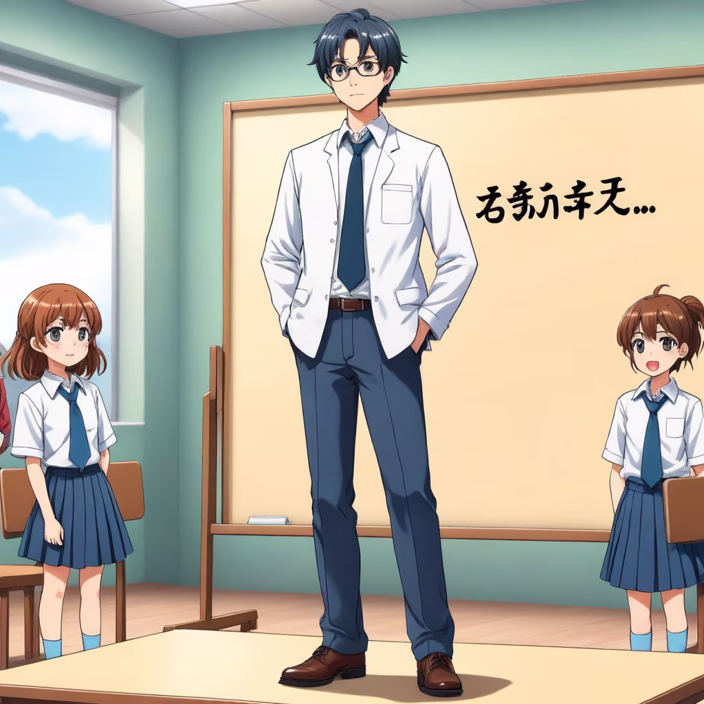Prompt: Classroom, podium, blackboard, male teacher (mature man), male teacher facing the camera, students, students with their backs to the camera