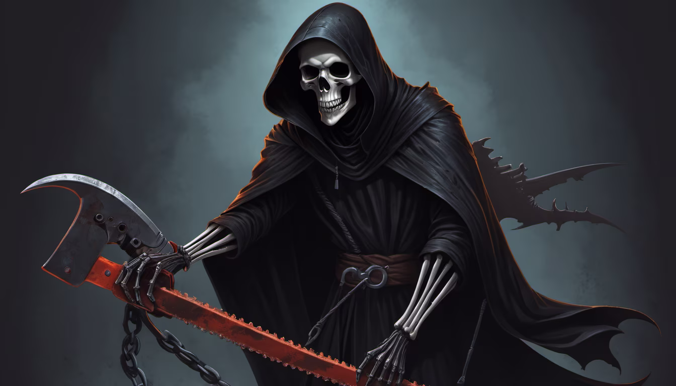 Prompt: scary grim reaper character with chainsaw scythe radically overly emphasis on dark gnarly