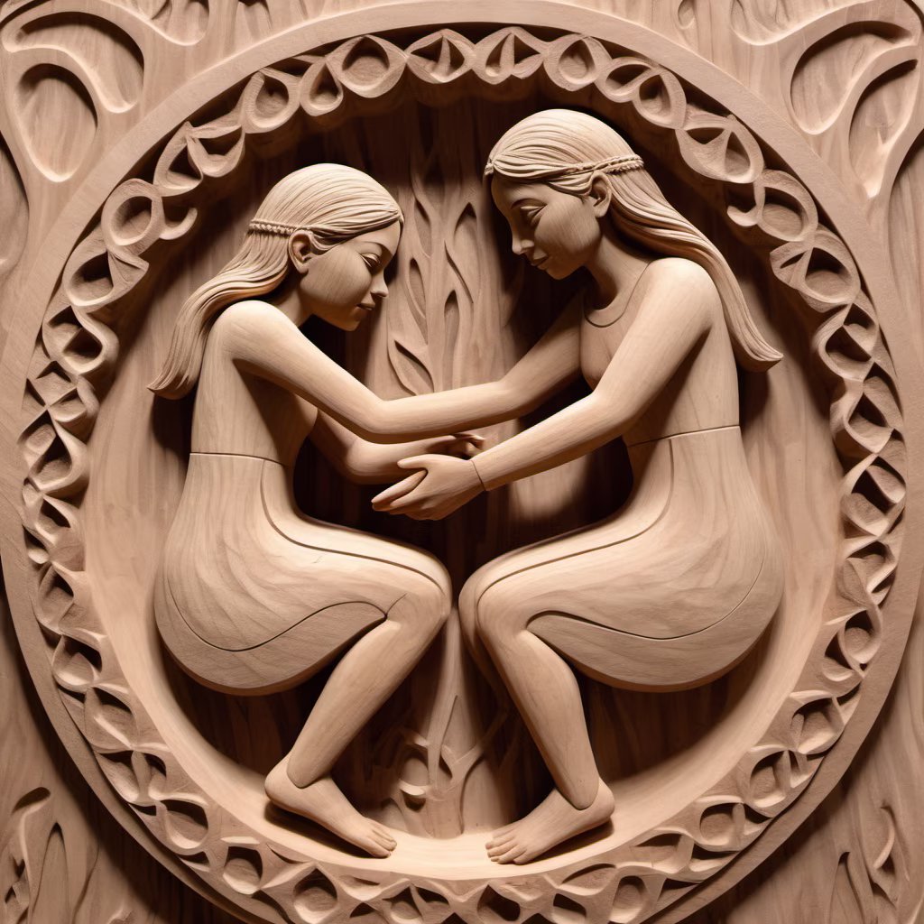 Prompt: Shaping them into human forms, they imbued life into these carvings, birthing Ask (Ash) and Embla (Elm), humanity's original ancestors.