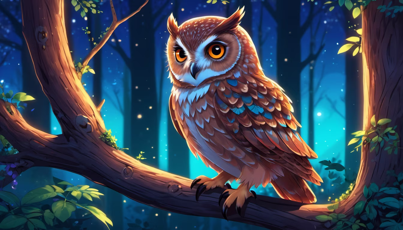 Prompt: One day, a cute little owl heard that the nighttime forest was filled with mysterious creatures and enchanting adventures.