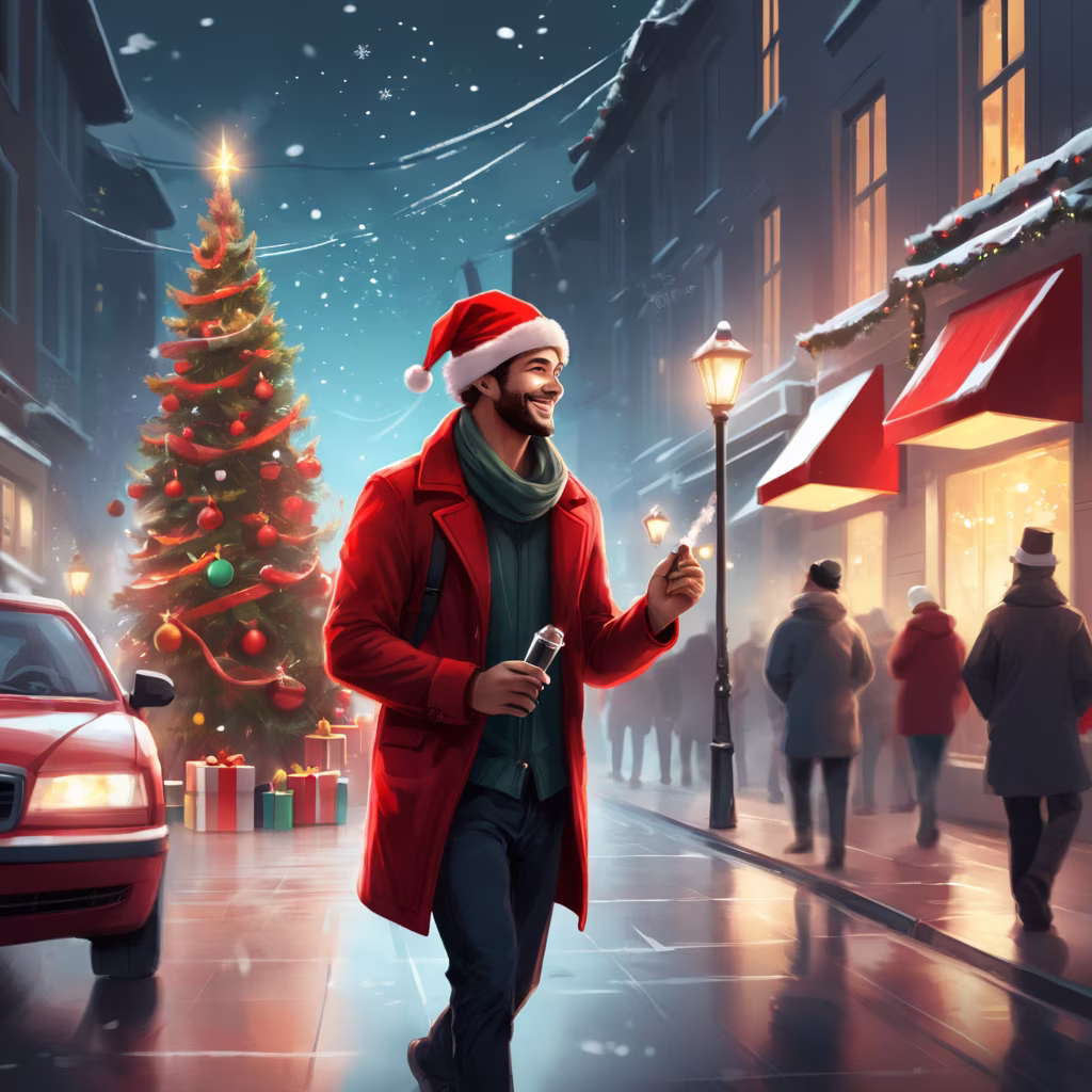Prompt: a man walking on the street in Christmas wearing in a red hat, vaping and smiling besides a christmas tree