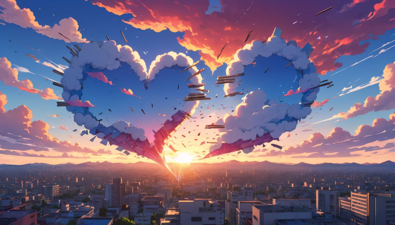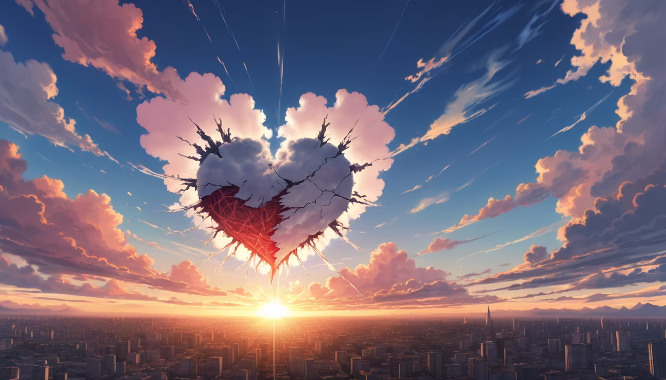 Prompt: A heart-shaped cloud, split and broken, appears in the sky as the sun sets, symbolizing the impending separation of two people.