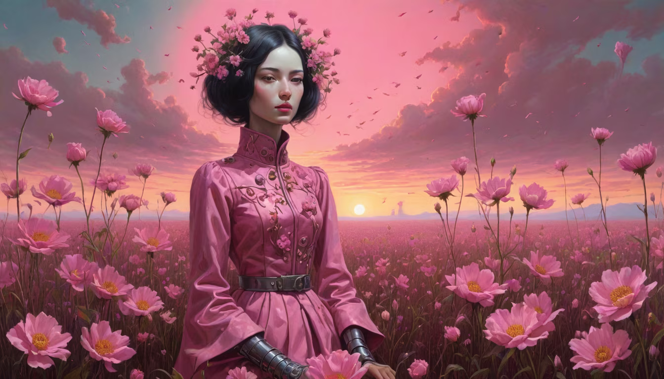 Prompt: Painting of a sunrise with pink flowers field, inspired by Rebecca Dautremer, popsurrealism, robot punk futuriste,Zdzislaw Beksiński , Asian- futurist style, Dorothea tanning, tom bagshaw,Aurelie neyret and benjamin Lacombe