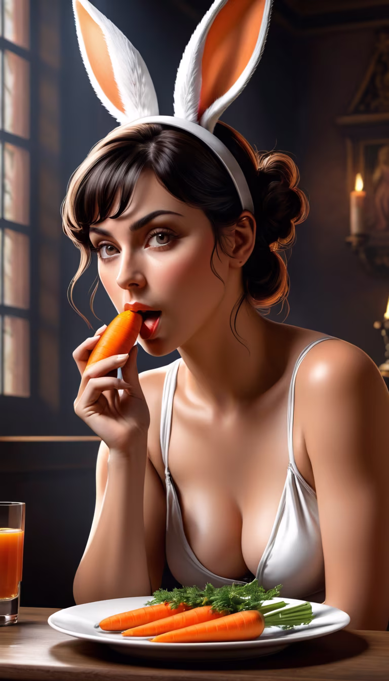Prompt: iso 400, photorealistic, 8k,realistic, realism, photorealism, high contrast, photorealistic, 8k high definition detailed realistic, (best quality, masterpiece:1.2), photon mapping, radiosity, physically-based rendering, best quality, highly detailed, a beautiful woman with bunny ears and full body tattoo, eating a carrot, In Art Style Of Caravaggio Michelangelo Merisi, (The image is digitally painted with a high level of detail and a focus on lighting and textures. It is trending on artstation and has a cinematic quality)