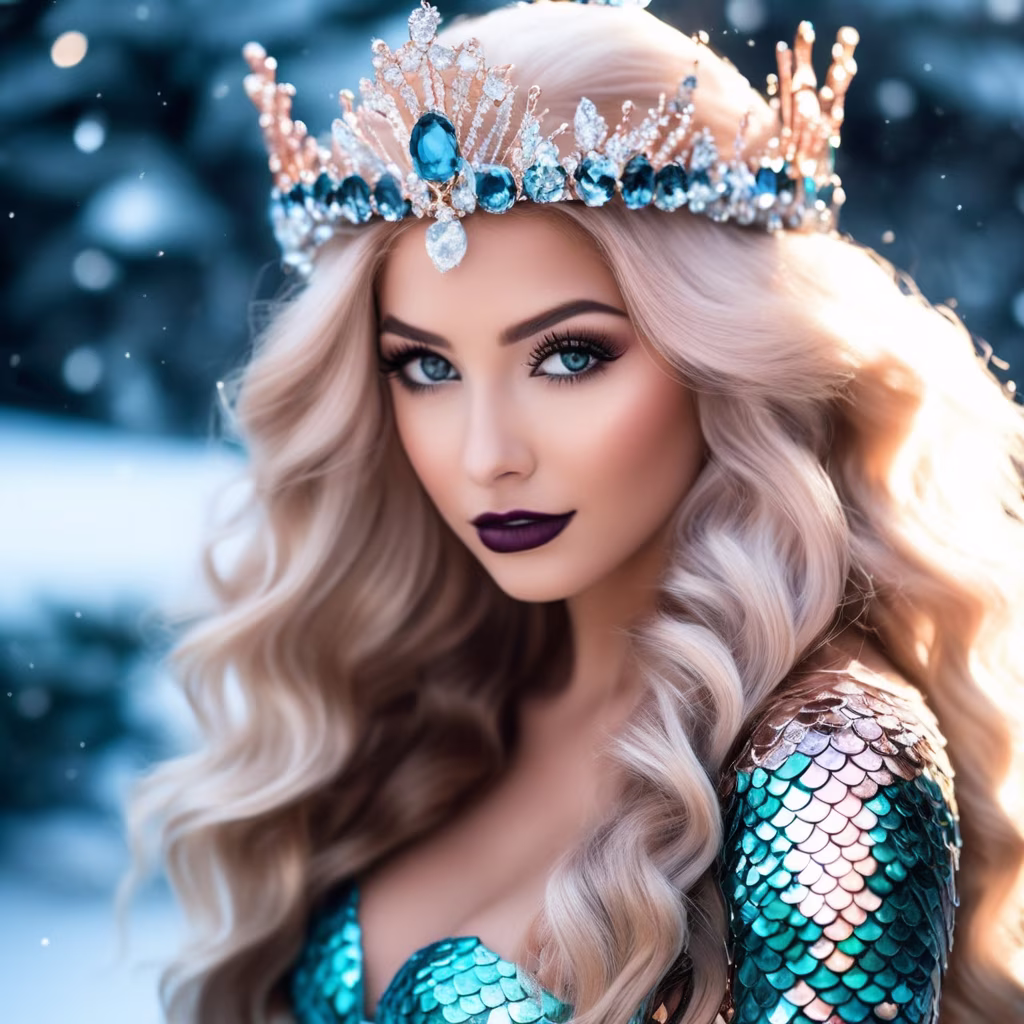 Prompt: create a winter mermaid, mermaid woman, very beautiful, beauty in woman, ice mermaid, with crystal tiara, with long, flowing hair, rose gold color, big hair, impeccable, perfect makeup, dark matte lipstick, beautiful makeup, ultra image, hd, premium image, high resolution