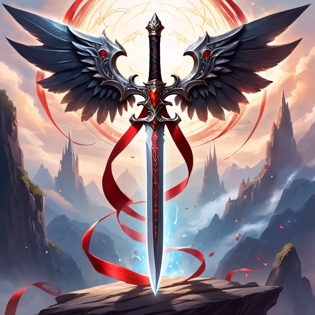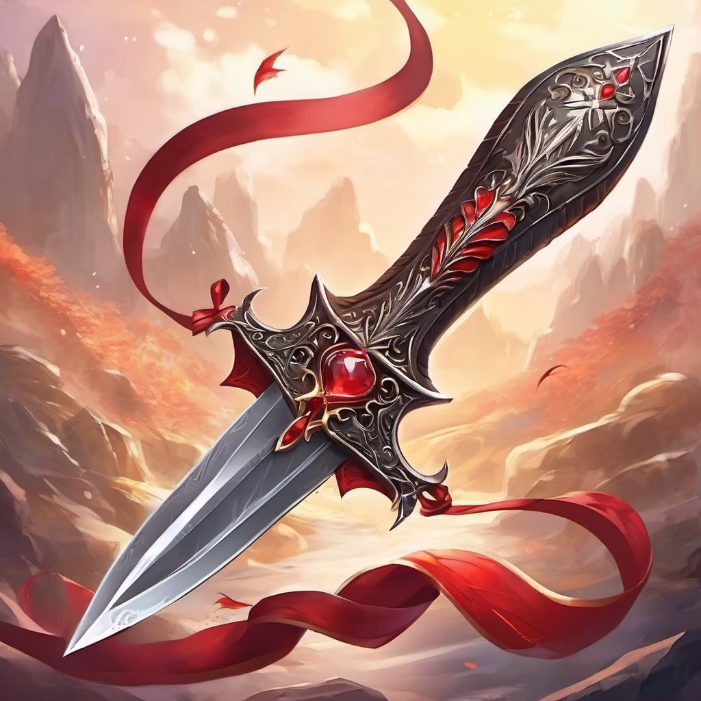 Prompt: Dagger with a black handle wrapped with a red ribbon, with a wide guard similar to wings, made of the same black metal as the handle, silver blade with details and pulsating red lines