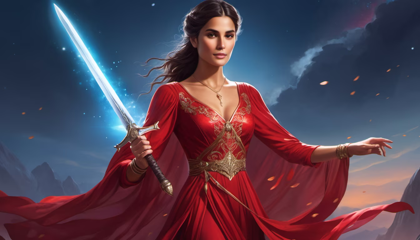 Prompt: a woman in red dress posing for a picture, inspired by Nelly Furtado, almost naked, sexy, attractive woman, love, sexy, ingame image, detail shot, perfectly shaded body, extremely high detail!! Sword in her hand