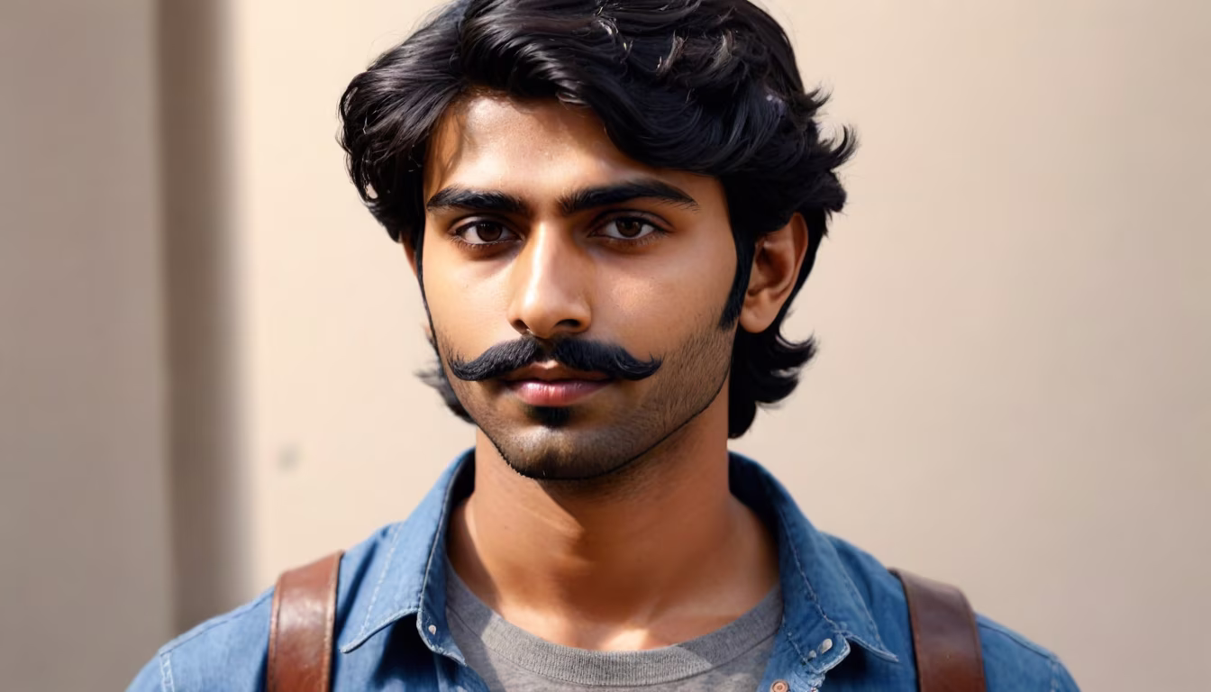 Prompt: Aarav Kapoor Age: 22 Occupation: Fine Arts Student Personality Traits: Passionate: Aarav is deeply passionate about his art, using it as a medium to express his emotions and thoughts. Introverted: He often finds solace in his sketchbook, expressing himself through his drawings rather than words. Cultural Enthusiast: Aarav is rooted in his Indian culture, showcasing traditional art forms in his work. Character Arc: Artistic Struggle: Aarav grapples with the clash between traditional and modern art in the pursuit of his passion. Love-driven Growth: Through his love for Kavya, Aarav learns to embrace change and find a balance between his artistic principles and personal growth. Aarav with thick mustache and beard a masculine male 18 year old, make him look more matured