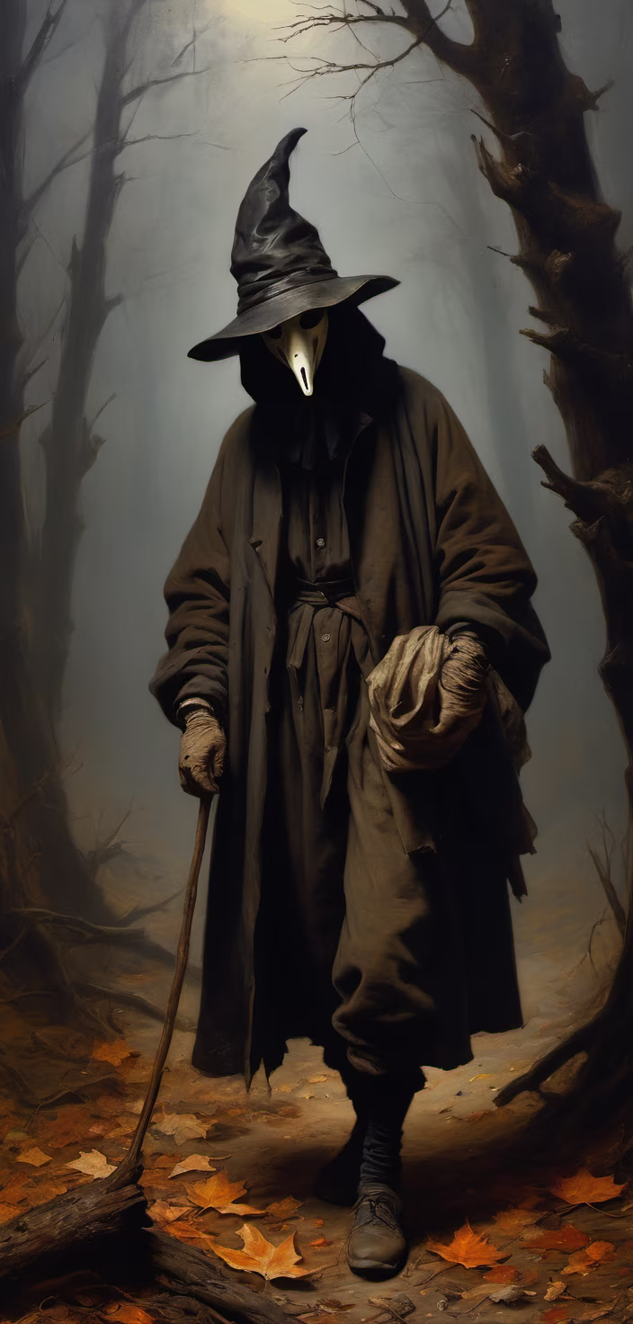 Prompt: A fleeing leper, dramatic landscape painting, tattered rags, pustules and boils, by Rembrandt, Caravaggio, loneliness and desperation, foggy moonlit woods, gnarled trees silhouettes, late autumn leaves crunching under foot, Rembrandtesque chiaroscuro lighting, plague doctor mask hanging from belt, 16K masterpiece, digital oil painting brush strokes, desperate escape, heightened emotion