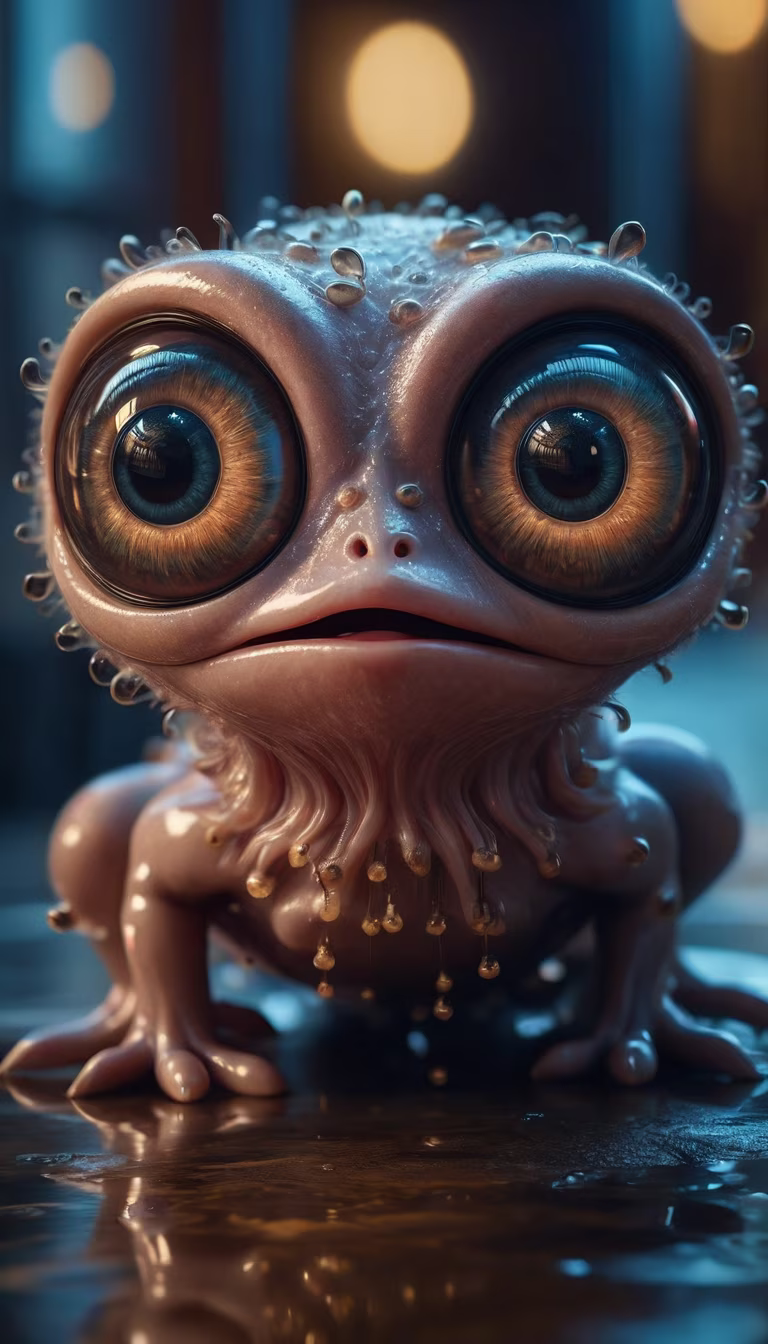 Prompt: Realistic creature, big reflective eyes, soft light photography, long exposure, 8K resolution, glossy shine, adorable charm, surreal realism, dreamy lighting, detailed features, 8K masterpiece, captivating reflections.