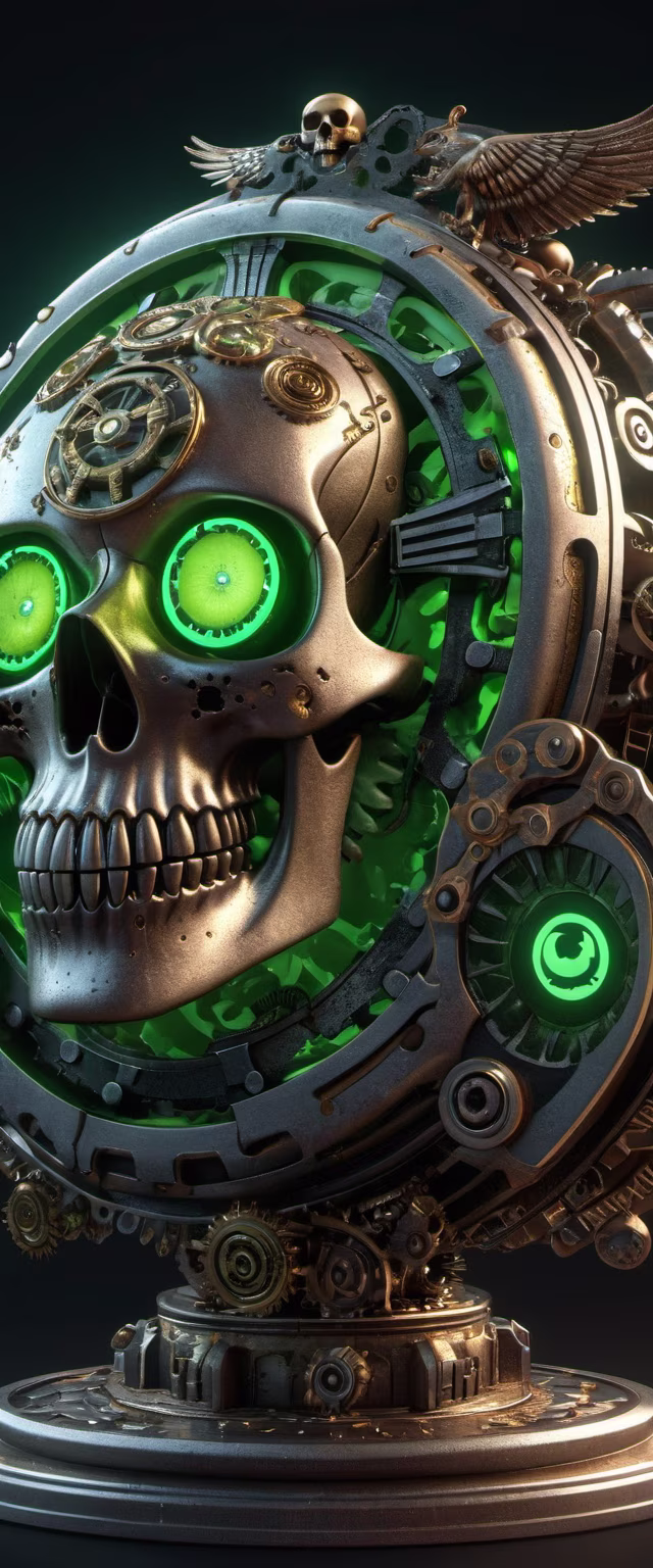 Prompt: steampunkcore gears, scary green slime, character design, sliced apples, skulls, tigers punkcore neon uva uvb Uvc lighting with scary bioluminescent ravens hd 3d 32k amazing gnarly abstract