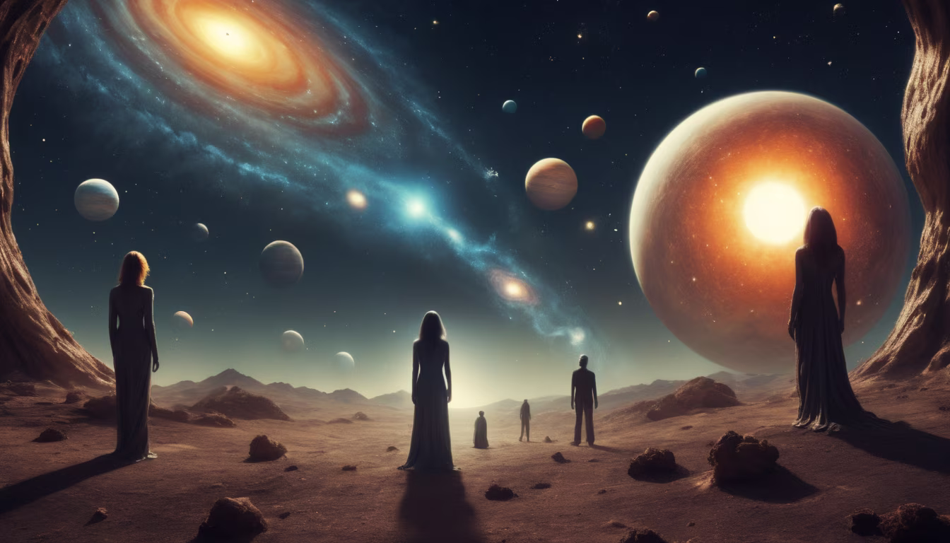 Prompt: a diverse group of space enthusiasts, immersed in a cosmic setting. Highlight their expressions of awe as they listen to the unique harmonies produced by celestial phenomena, with an emphasis on the vastness of space around them.