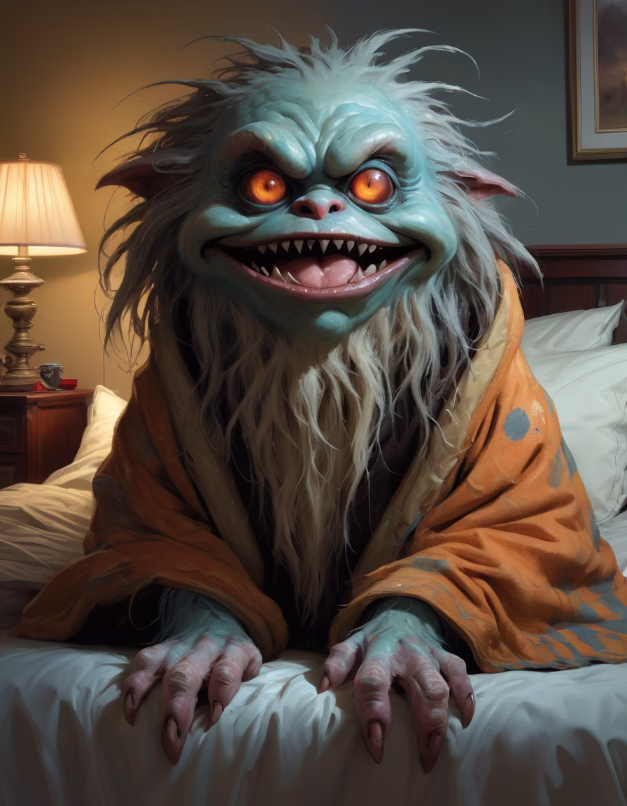 Prompt: digital painting of a bipedal furry long-haired bulbous-eyed monster on my bed cozied up in blankets and pillows enormous but cute oddity by jeremy mann and Craig Mullins and Michael Komarck
