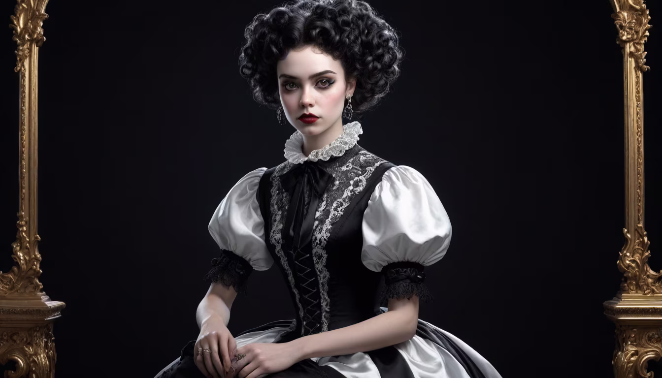 Prompt: a lady sitting on a stool, a character portrait, gothic makeup, inspired by Ray Caesar, black and white, trending on cg society, (rococo) , (dark shorter curly hair), black anime manga girl, wearing gothic accessories, Volumetric and dynamic lighting. Hyperrealistic photorealistic hyperdetailed maximalist masterpiece