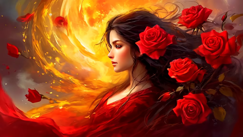 Prompt: woman in profile with shoulders samples red clothes long straight black hair red rose in hair scary yellow background