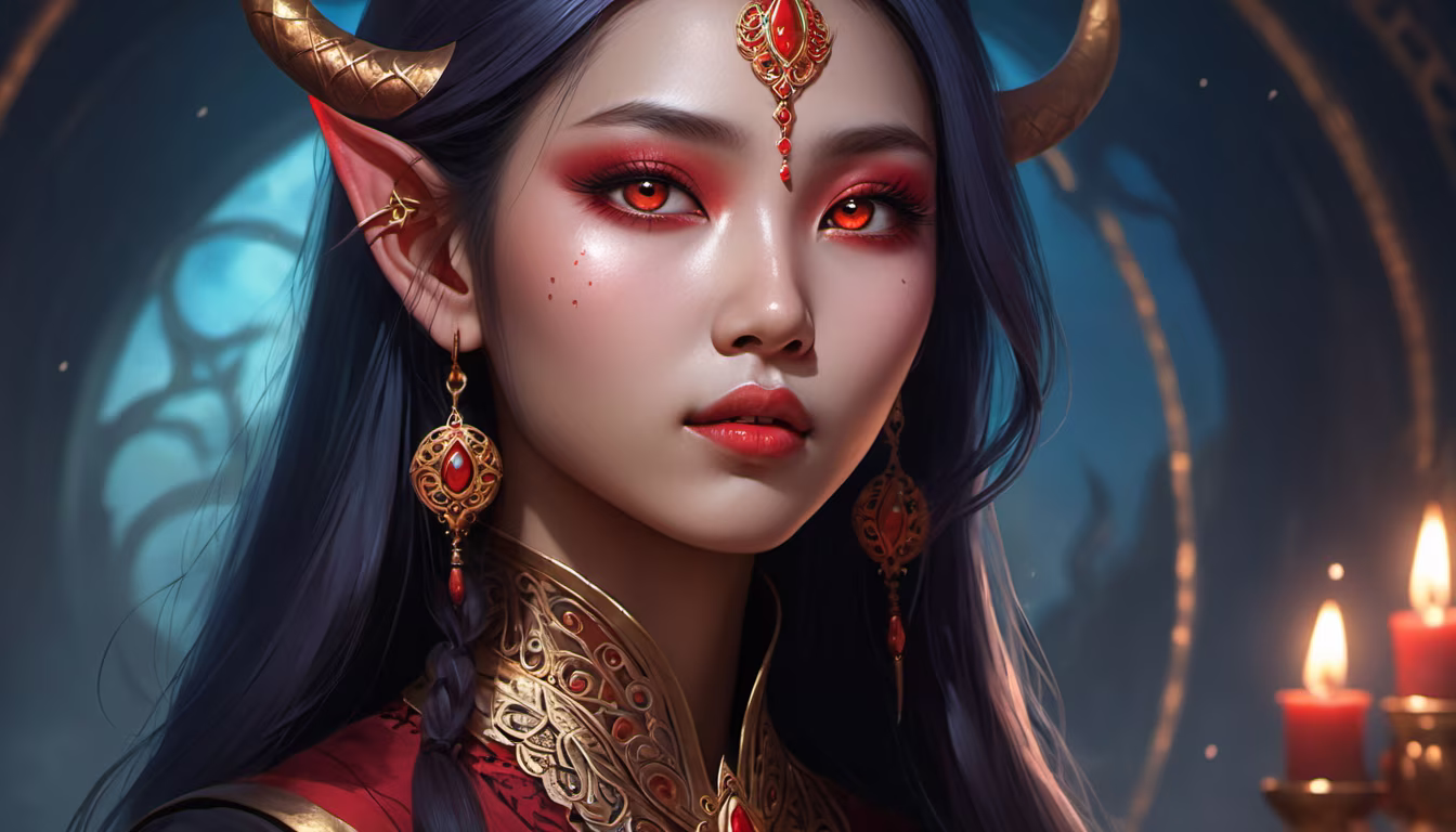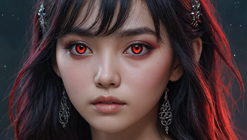 Prompt: very beatiful thai woman with big gorgeous red eyes 25 years old with septum piersing, black tattoes on body, dyed hair, playfull look, rim bright light