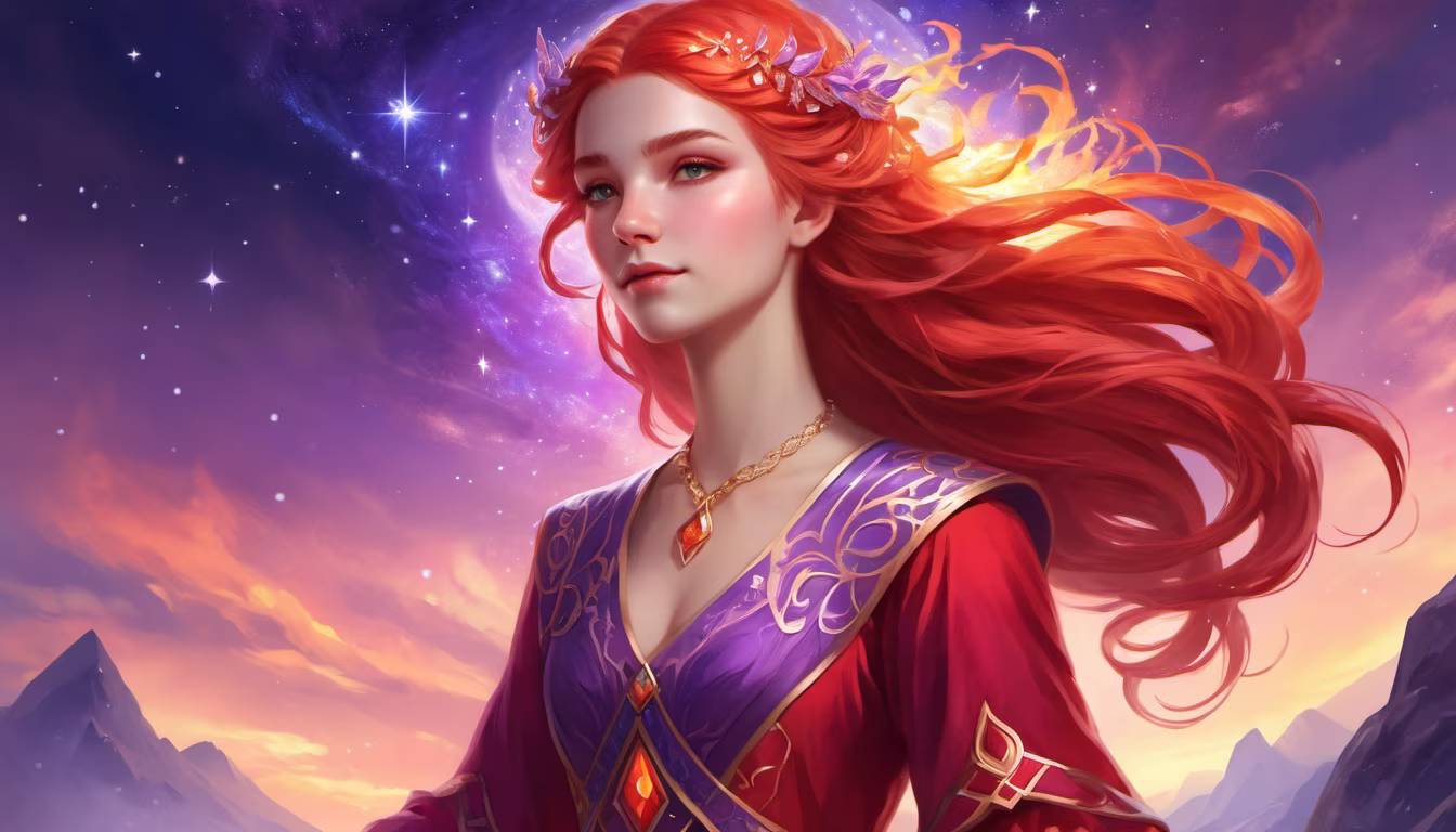 Prompt: Pihla Vitala with flaming hair in stellar brightest red and lilac gemstoned dress