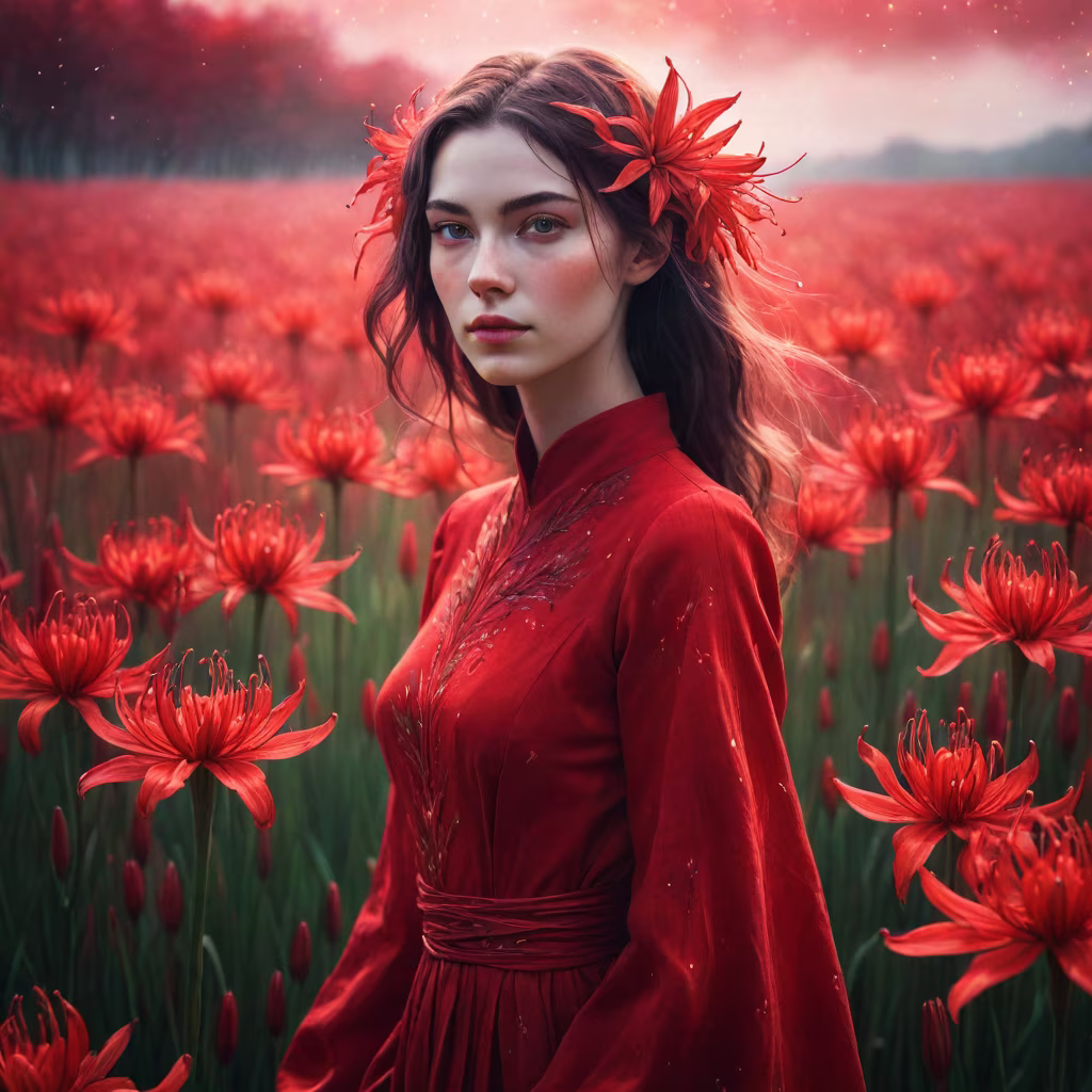 Prompt: Beautiful woman in profile, closed eyes, a red thread stretches from the woman's chest, the woman holds this thread with her hand, flowers around the woman, bare shoulders, lots of details, warm colors, neon colors