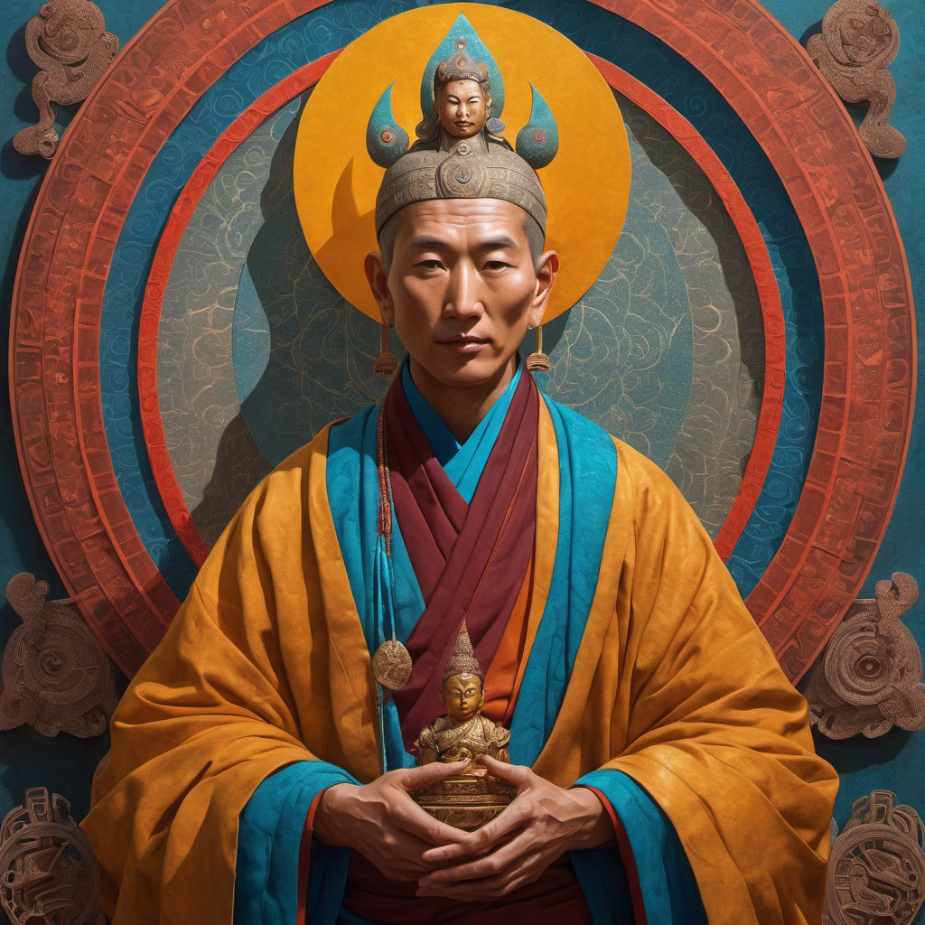 Prompt: ksitigarbha Bodhisattva, thangka style, inventive character designs, peter gric, todd mcfarlane, colorful