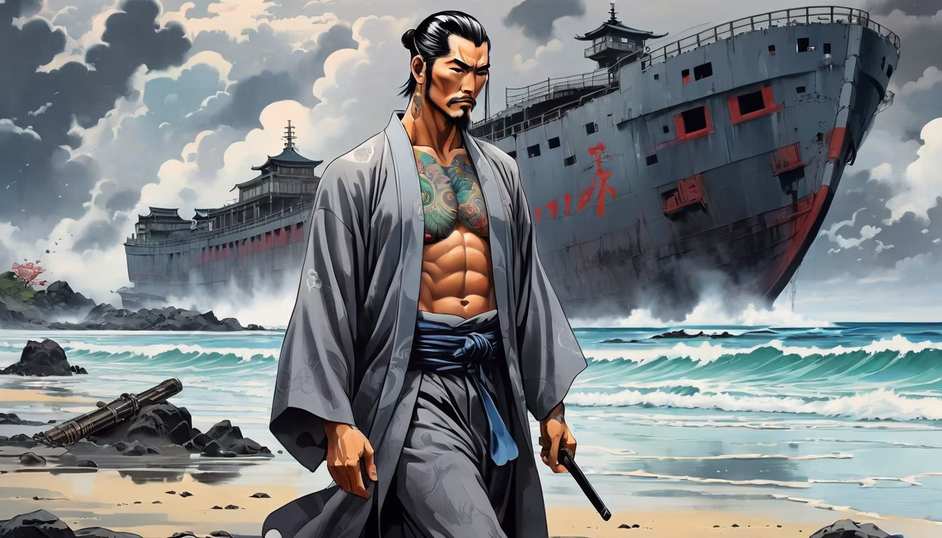 Prompt: full body, impressionistic dramatic world, Japanese Yakuza with a tattooed torso in a gray japanese kimono, walks along the seashore with a sunken ship in the background, hatred, anger, sullen, fog, clouds, dramatic pose, The delicate strokes and subdued colors capture the atmosphere, emphasizing the emotions of the characters, Japanese art, ancient Japanese style, very colorful, dark true colors, detailed facial features, detailing, detailed background, quality, by Boris Vallejo Frank Miller