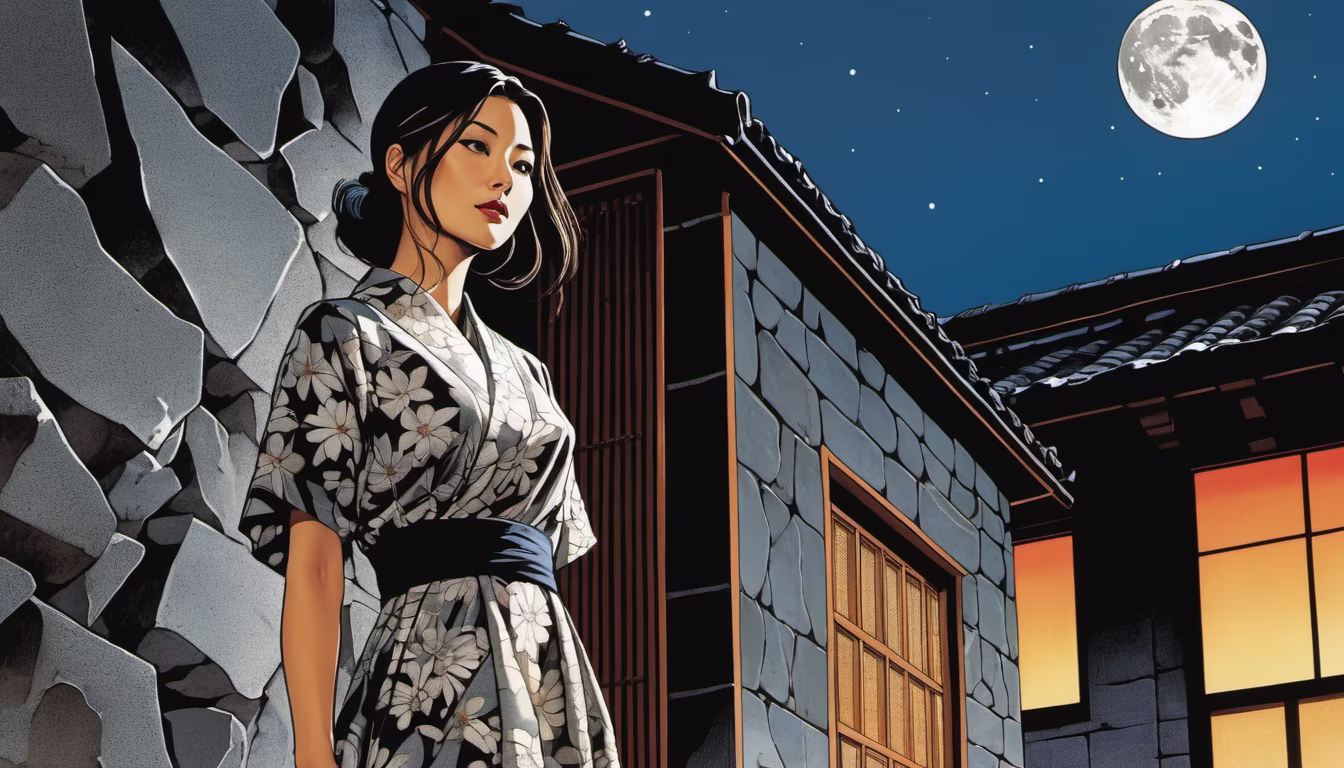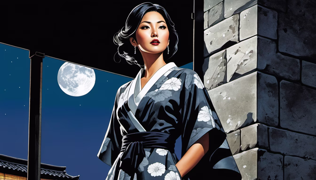 Prompt: full body, impressionistic dramatic world, 35-year-old Japanese woman (Meisa Kuroki), stands against a stone wall in a poor neighborhood in Tokyo,sidewalk, night, moon, twilight, dramatic pose, The delicate strokes and subdued colors capture the atmosphere, emphasizing the emotions of the characters, 60s, Japanese art, Japanese style, colorful, dark gray colors, detailed facial features, detailing, detailed background, quality, by Alex Ross Frank Miller