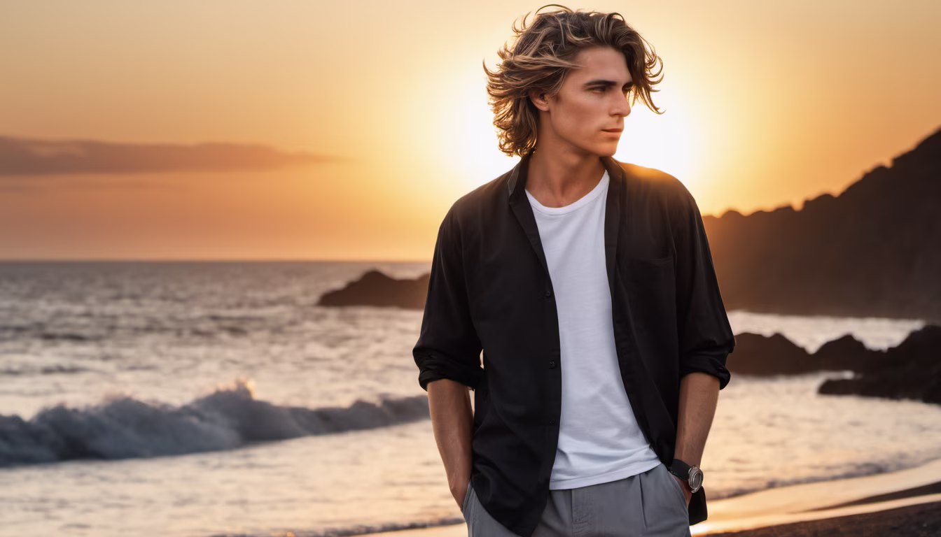 Prompt: A man standing at the seaside, smoking a cigarette. He is wearing a loose T-shirt, pants, and slippers. His hair is tousled by the sea breeze, and his eyes reveal a hint of contemplation and fatigue. Behind him is a vast ocean, with waves crashing against the rocky shore. The sunlight filters through the clouds, casting a serene and reflective atmosphere. High-resolution photo of a man smoking at the beach with a peaceful sea and beautiful sunset in the background. Clear focus on the man's face and the smoke from the cigarette. Perfect composition and lighting, reminiscent of classic black and white photography by Ansel Adams or Henri Cartier-Bresson.