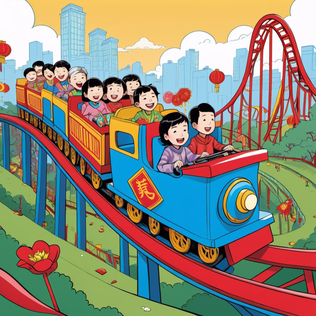 Prompt: play ground, Roller Coaster, train,candy and chocolate,chinese new year,Brief strokes