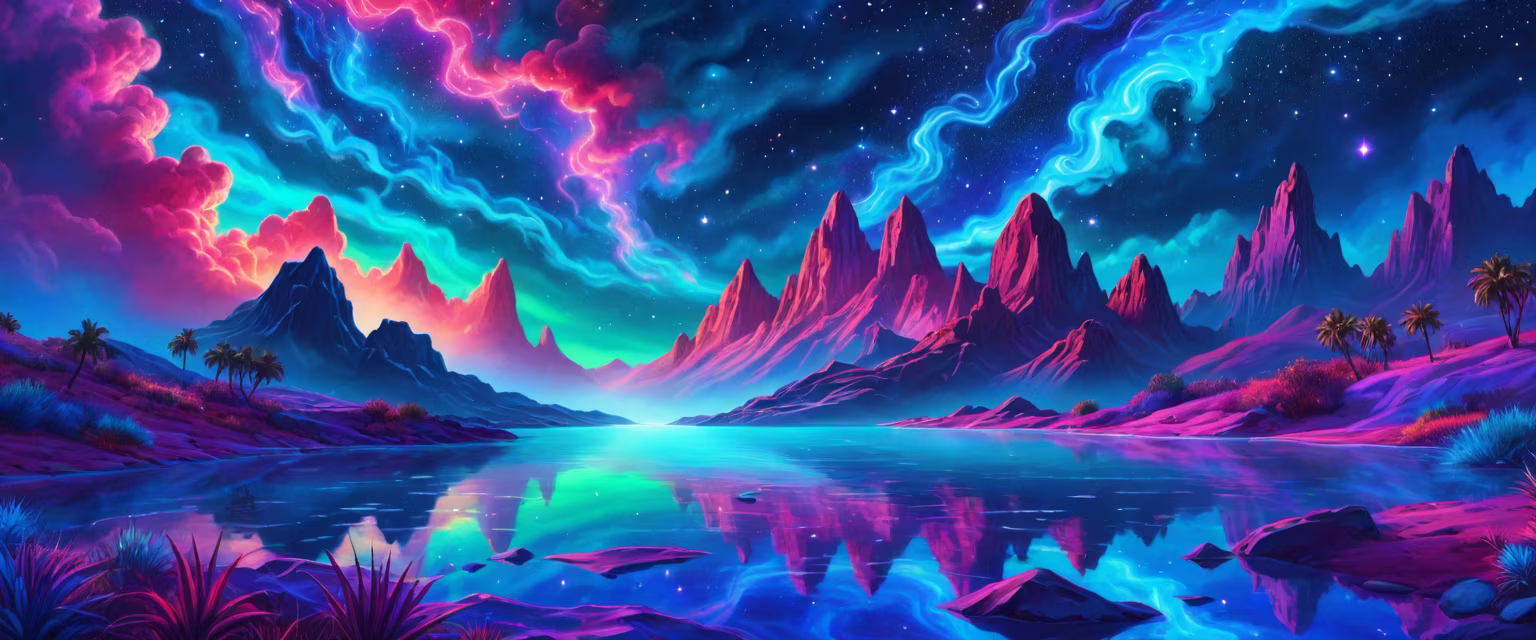 Prompt: extremely detailed quantum psychedelic complex blue green purple red huge (((glowing blue laguna))) vivid night, stellarful sky
