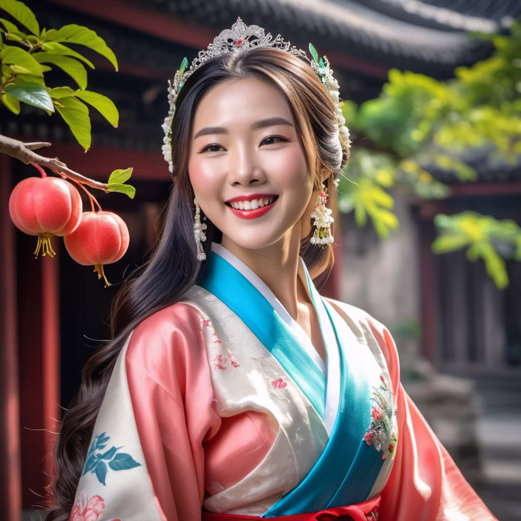 Prompt: asian woman with long wavy hair, wearing hanfu and gold tiara grinning, cheerful in a Hutong courtyard house surrounded by Lychee trees, longan trees and guava trees, 64k, hdr, masterpiece, highest resolution, highest quality