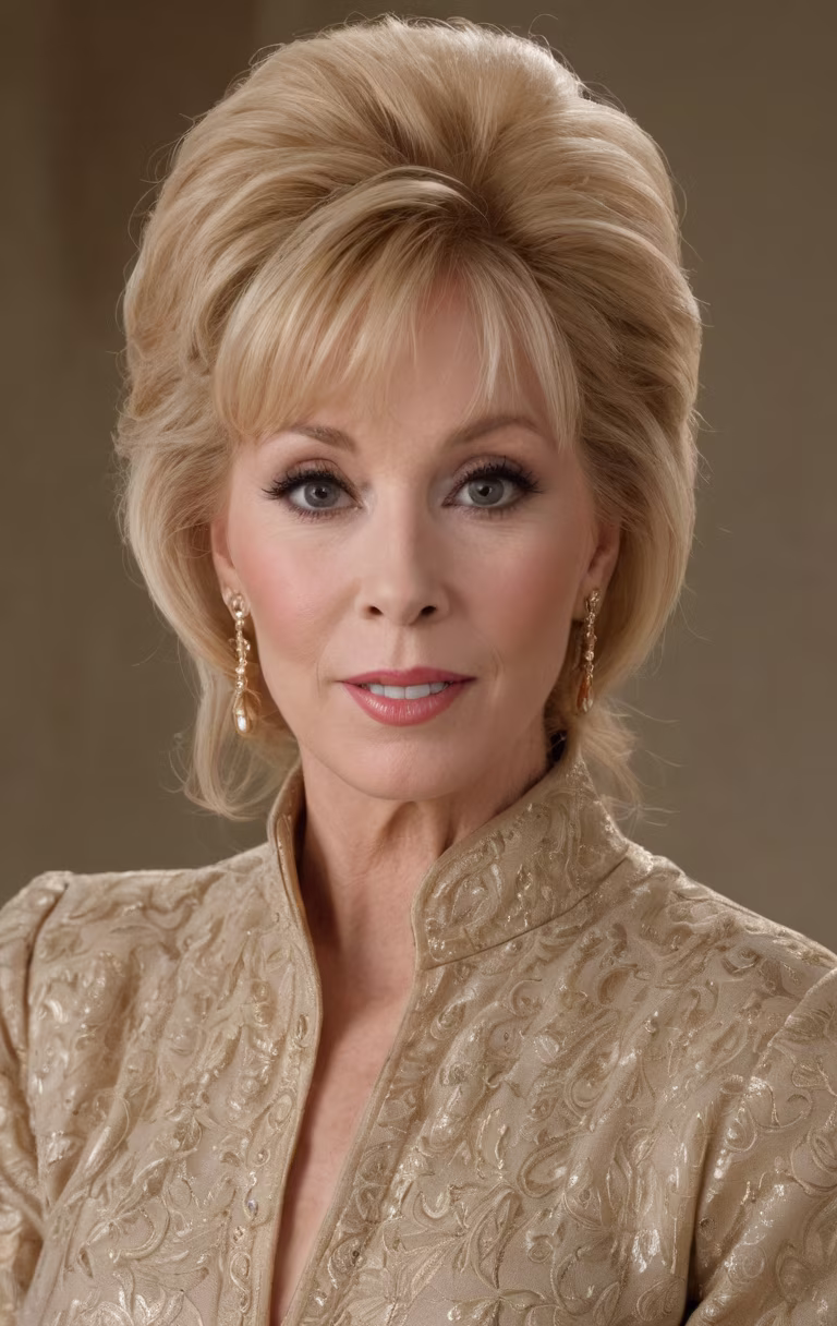 Prompt: Year:1990. Candid photograph. (high view: 1.5) High detail, Canon EOS DSLR photograph. UHD, 8K resolution, sharp focus, full color, close up, intimate headshot portrait of Barbara Eden in 1990. Her hairstyle fills the viewframe. Her thick, full-bodied, richly textured hair is arranged in a precise, meticulous, highly voluminous, very lofty style. Solid color background. Accurate 1990 styling.