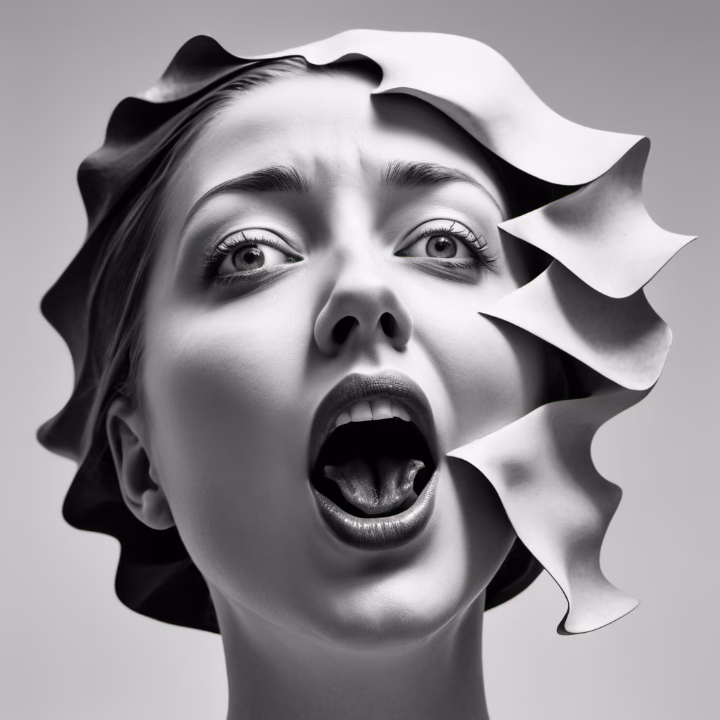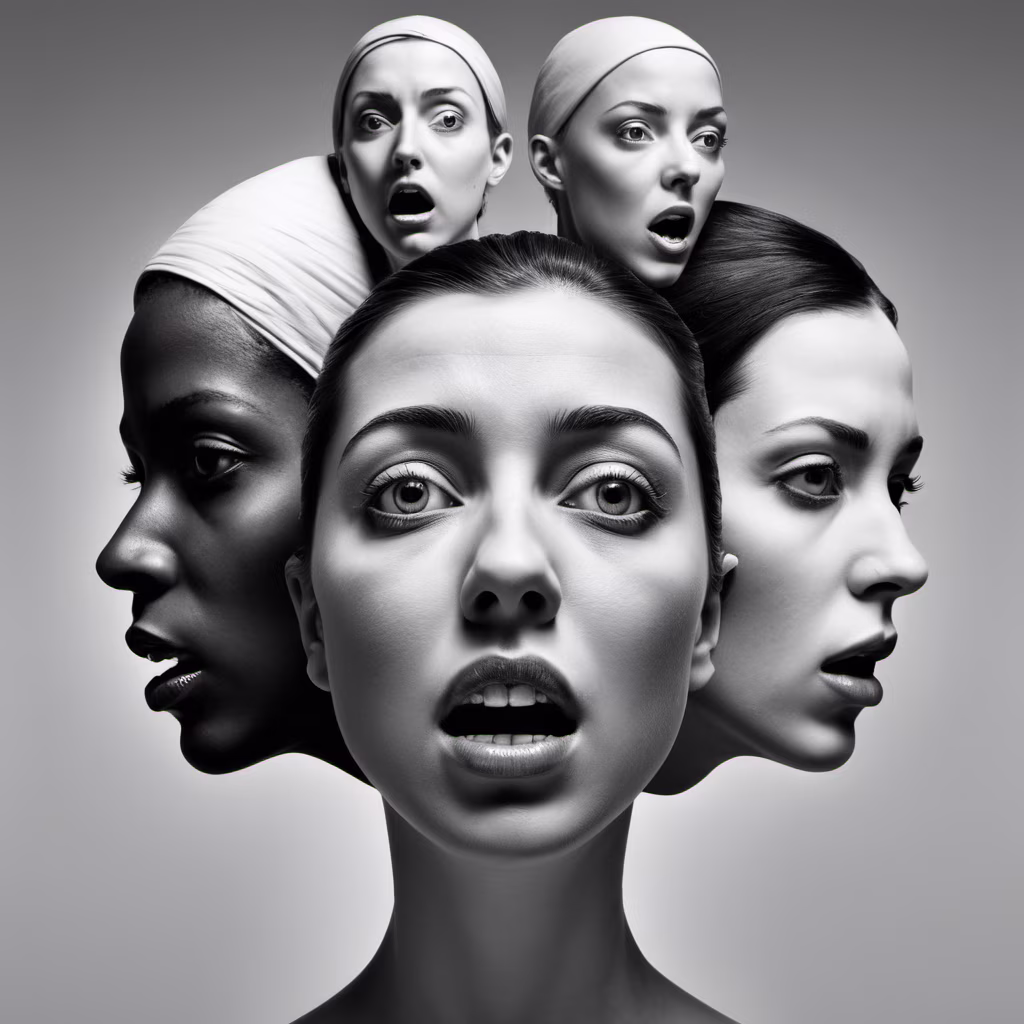 Prompt: a black and white photo of a woman's face, a surrealist sculpture, inspired by Igor Morski, hyperrealism, 4 heads, black people, show from below, trending on juxtapoz magazine, shouting, anna dittman, scream