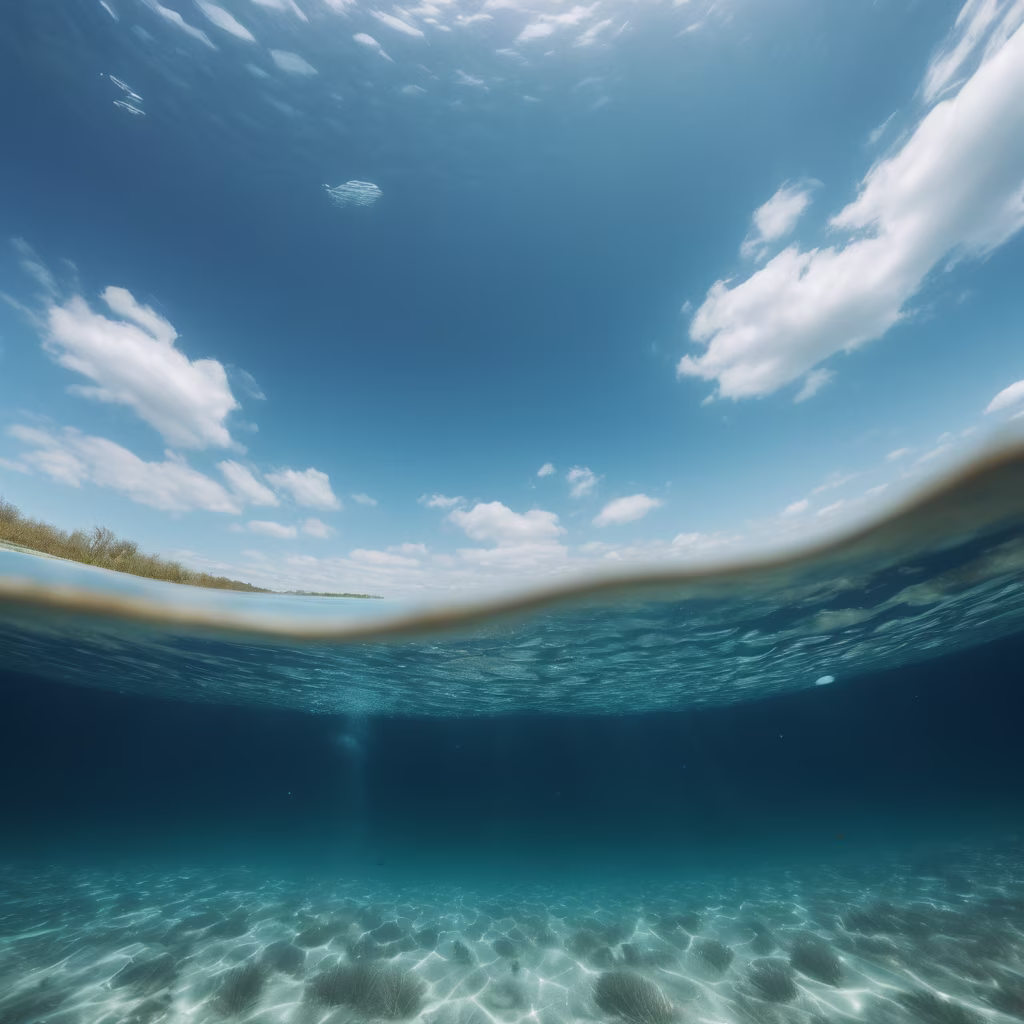 Prompt: half submerged photo of underwater and sky split image ,the bustling underwater world just below , half submerged photo ultra clear water